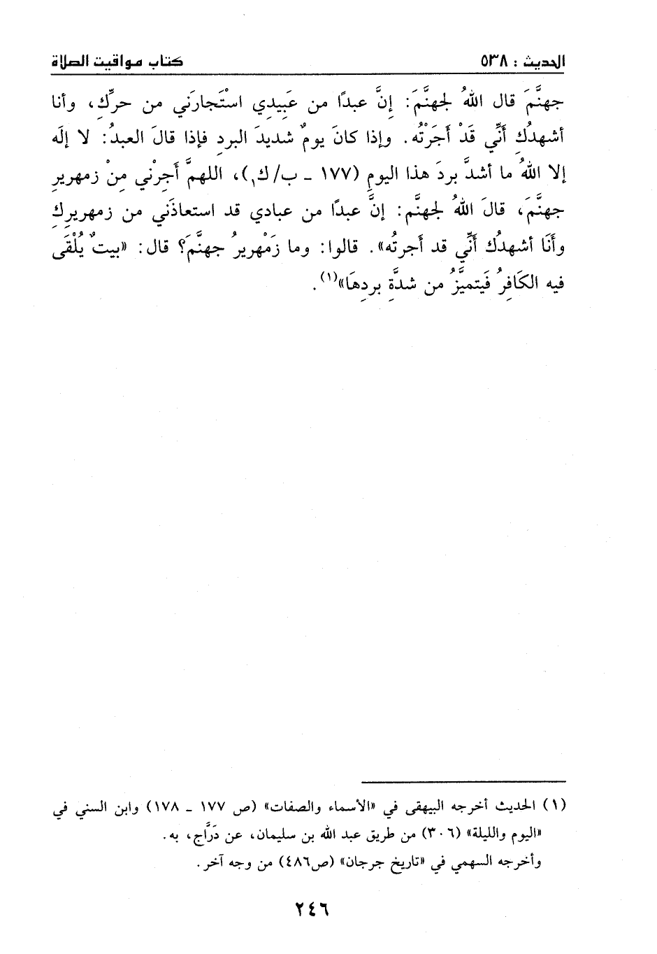 جهنم، قال الله لجهنم: إن عبداً من عبيدي استجارني من حرك، وأنا أشهدك أني قد أجرته، وإذا كان يوم شديد البرد، فإذا قال العبد: لا إله إلا الله، ما أشد برد هذا اليوم، اللهم أجرني من زمهرير جهنم، قال الله لجهنم: إن عبداً من عبادي قد استعاذني من زمهريرك، فإني أشهدك أني قد أجرته)) . قالوا: وما زمهرير جهنم؟ قال: ((بيت يلقى فيه الكافر فيتميز من شدة بردها)) .
