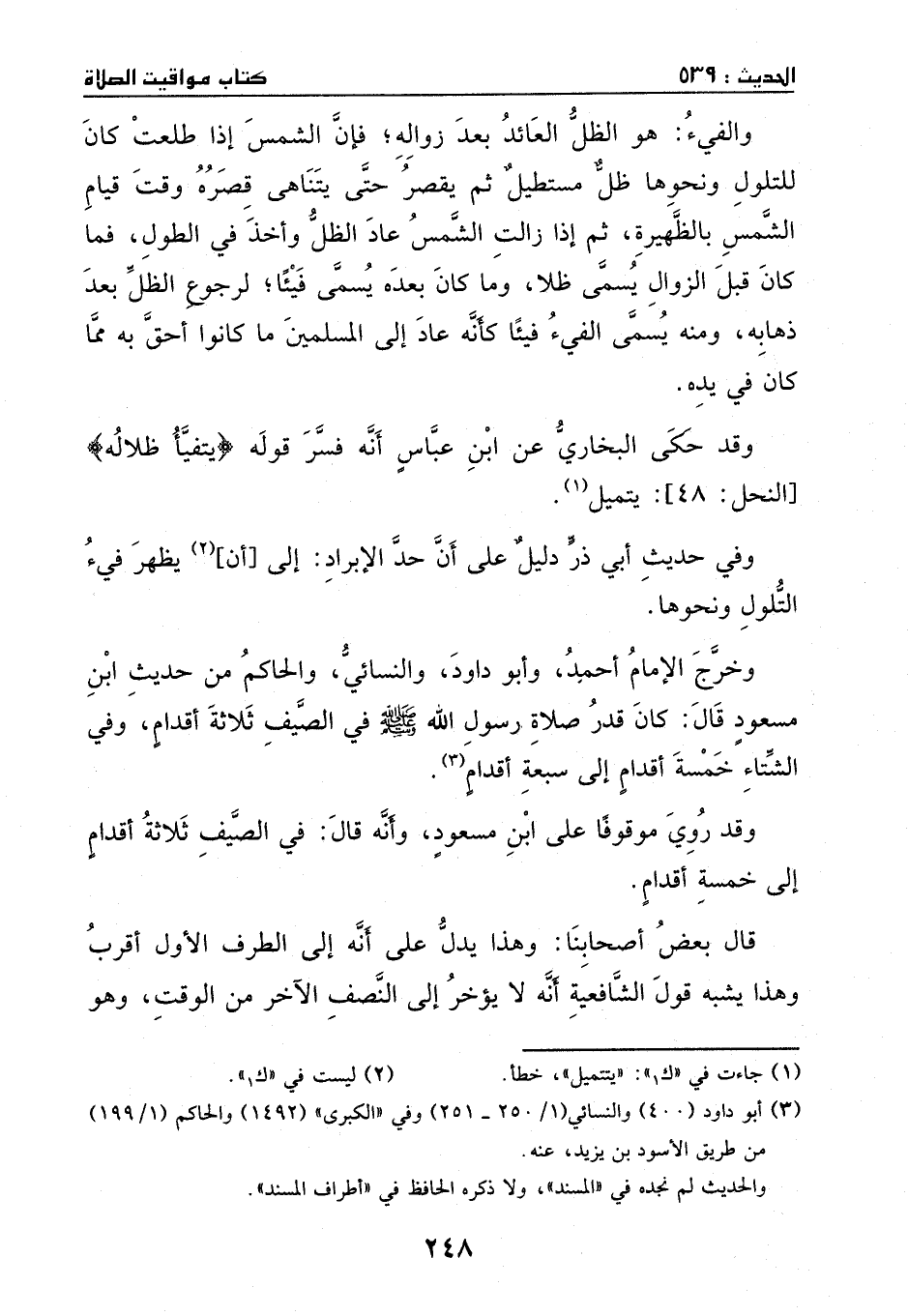 وخرج الإمام أحمد وأبو داود والنسائي والحاكم من حديث ابن مسعود، قال: كان قدر صلاة رسول الله - صَلَّى اللهُ عَلَيْهِ وَسَلَّمَ - في الصيف ثلاثة أقدام، وفي الشتاء خمسة أقدام إلى سبعة أقدام.