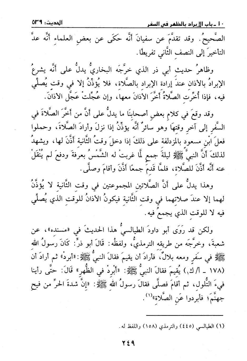 ولكن قد روى أبو داود الطيالسي هذا الحديث في " مسنده"، عن شعبة - وخرجه من طريقه الترمذي - ولفظه: قال أبو ذر: كان رسول الله - صَلَّى اللهُ عَلَيْهِ وَسَلَّمَ - في سفر ومعه بلال، فأراد ان يقيم، فقال النبي - صَلَّى اللهُ عَلَيْهِ وَسَلَّمَ -: " أبرد"، ثم أراد أن يقيم، فقال النبي - صَلَّى اللهُ عَلَيْهِ وَسَلَّمَ -: " أبرد في الظهر". قال: حتى رأينا فيء التلول، ثم أقام فصلى، فقال رسول الله - صَلَّى اللهُ عَلَيْهِ وَسَلَّمَ -: " إن شدة الحر من فيح جهنم، فأبردوا عن الصلاة".
