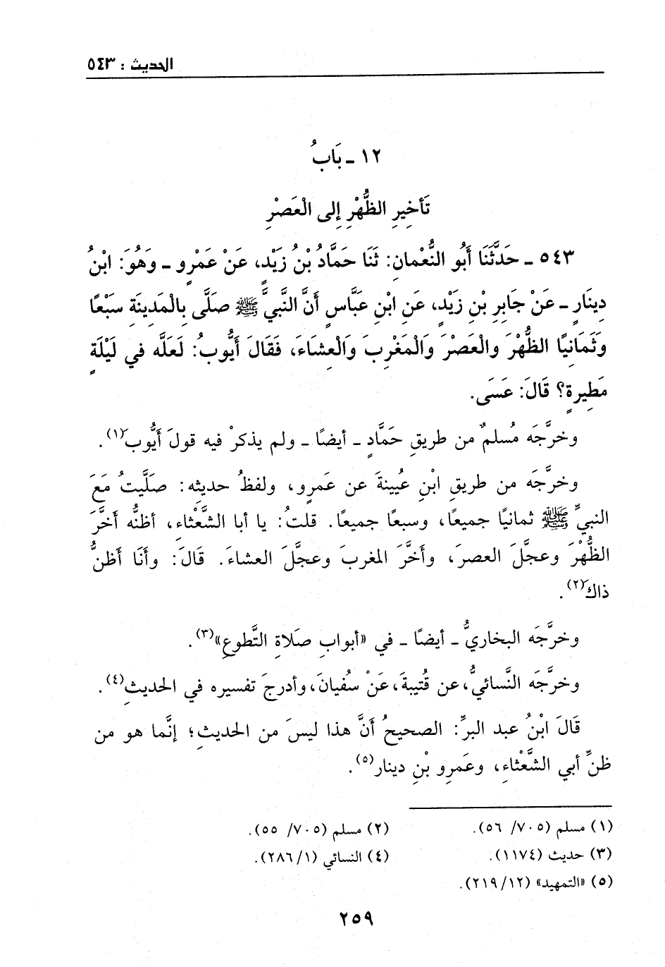 543 – حدثنا أبو النعمان: ثنا حماد بن زيد، عن عمرو - وهو: ابن دينار - عن جابر بن زيد، عن ابن عباس، أن النبي - صَلَّى اللهُ عَلَيْهِ وَسَلَّمَ - صلى بالمدينة سبعا وثمانيا الظهر والعصر والمغرب والعشاء.