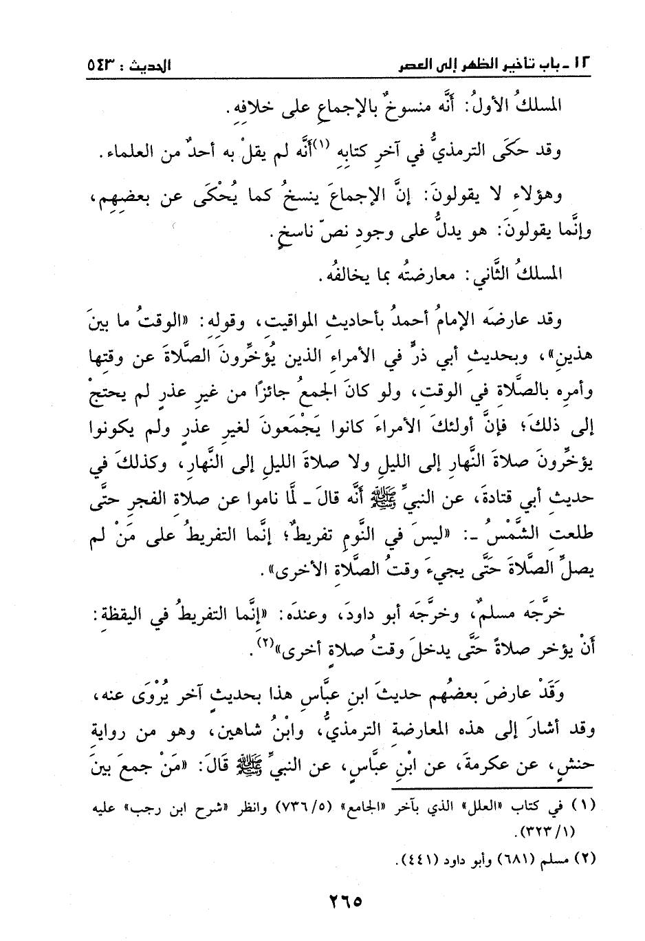 المسلك الثاني: معارضته بما يخالفه، وقد عارضه الإمام أحمد بأحاديث المواقيت، وقوله: " الوقت ما بين هذين"، وبحديث أبي ذر في الأمراء الذين يؤخرون الصلاة عن وقتها، وأمره بالصلاة في الوقت، ولو كان الجمع جائزاً من غير عذر لم يحتج إلى ذلك، فإن أولئك الأمراء كانوا يجمعون لغير عذرٍ، ولم يكونوا يؤخرون صلاة النهار إلى الليل، ولا صلاة الليل إلى النهار.
