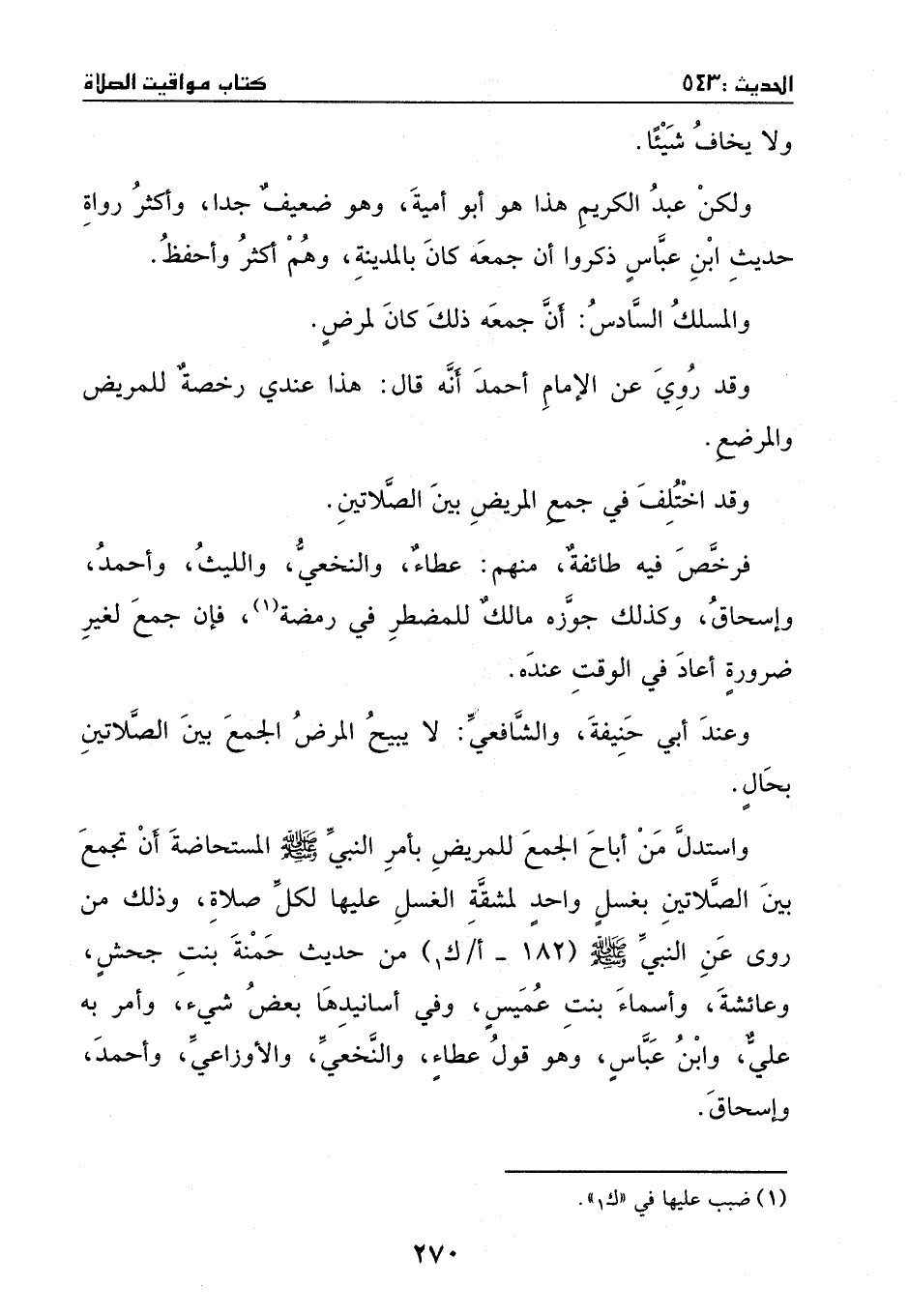 واستدل من أباح الجمع للمريض، بأمر النبي - صَلَّى اللهُ عَلَيْهِ وَسَلَّمَ - المستحاضة أن تجمع بين الصلاتين بغسل واحد؛ لمشقة الغسل عليها لكل صلاة، وذلك ما روي عن النبي - صَلَّى اللهُ عَلَيْهِ وَسَلَّمَ - من حديث حمنة بنت جحش وعائشة وأسماء بنت عميس، وفي أسانيدها بعض شيء.