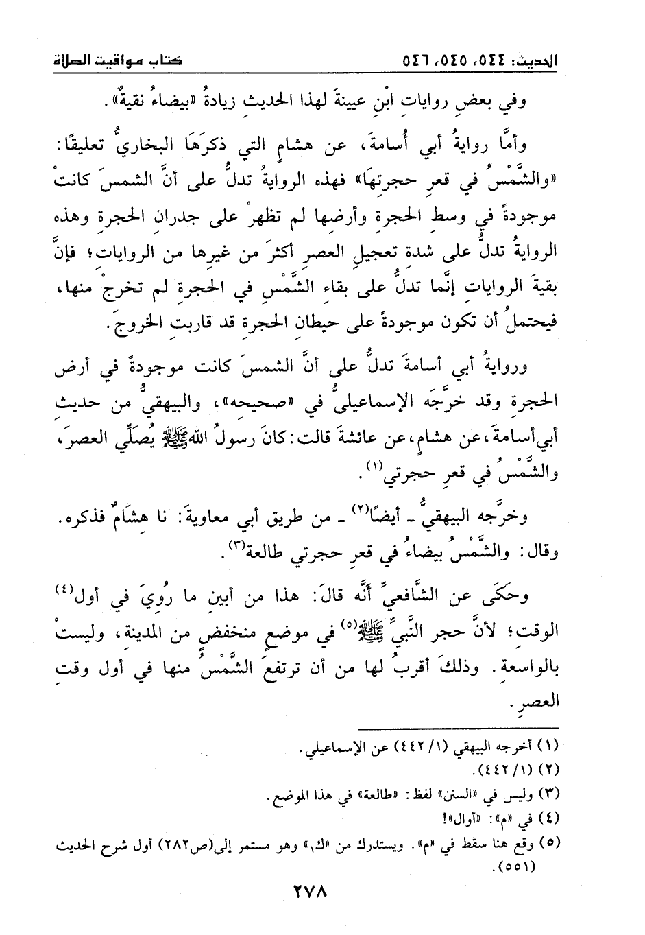 وقد خرجه الإسماعيلي في " صحيحه" والبيهقي من حديث أبي أسامة، عن هشام، عن عائشة، قالت: كان رسول الله - صَلَّى اللهُ عَلَيْهِ وَسَلَّمَ - يصلي العصر والشمس في قعر حجرتي.