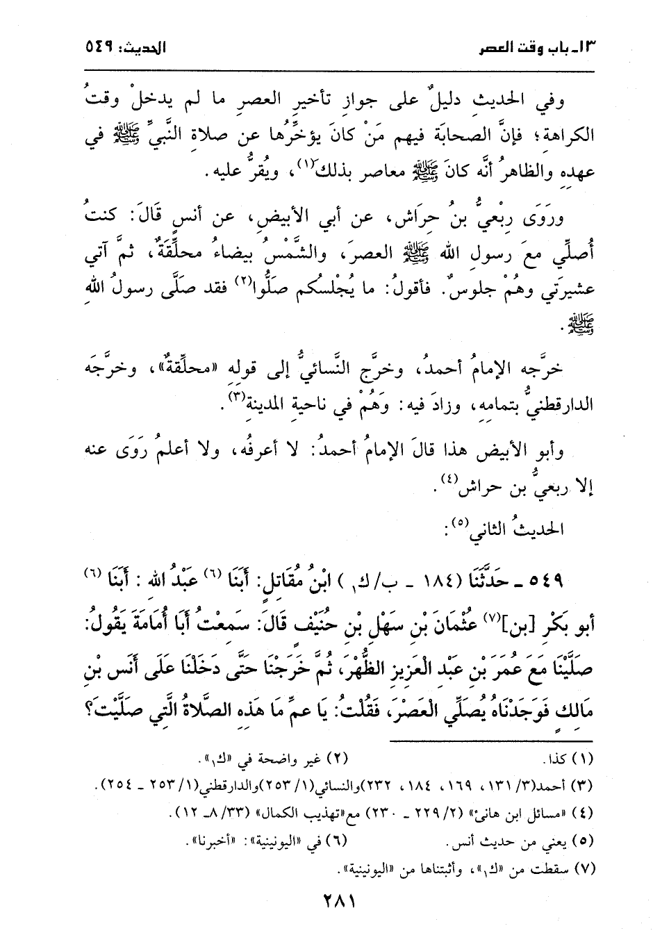 549 - حدثنا ابن مقاتل: أبنا عبد الله: أبنا أبو بكر بن عثمان بن سهل بن حنيف، قال: سمعت أبا أمامة يقول: صلينا مع عمر بن عبد العزيز الظهر، ثم خرجنا حتى دخلنا على أنس بن مالك، فوجدناه يصلي العصر، فقلت: ياعم، ما هذه الصلاة التي صليت؟