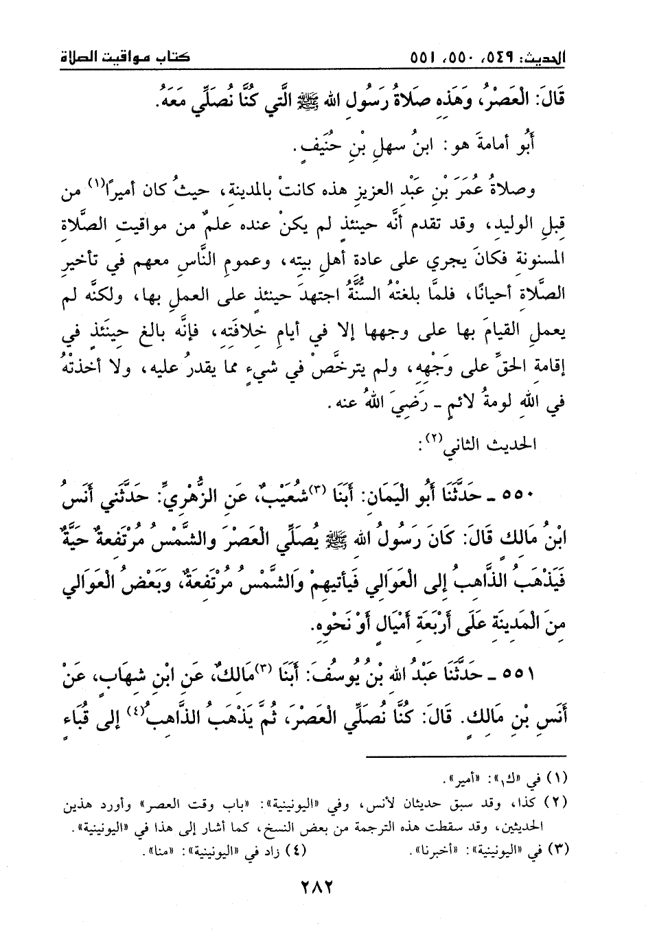 550 - حدثنا أبو اليمان: أبنا شعيب، عن الزهري: حدثني أنس بن مالك، قال: كان رسول الله - صَلَّى اللهُ عَلَيْهِ وَسَلَّمَ - يصلي العصر والشمس مرتفعة حية، فيذهب الذاهب إلى العوالي، فيأتيهم والشمس مرتفعة.