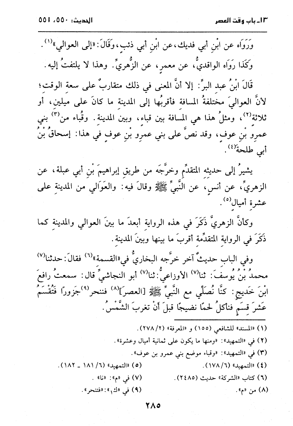 قال ابن عبد البر: إلا أن المعنى في ذلك متقارب على سعة الوقت؛ لأن العوالي مختلفة المسافة، فأقربها إلى المدينة ما كان على ميلين أو ثلاثة، ومثل هذا هي المسافة بين قباء وبين المدينة، وقباء من بني عمرو بن عوف، وقد نص على بني عمرو بن عوف في [حديث أنس] هذا إسحاق بن أبي طلحة.
