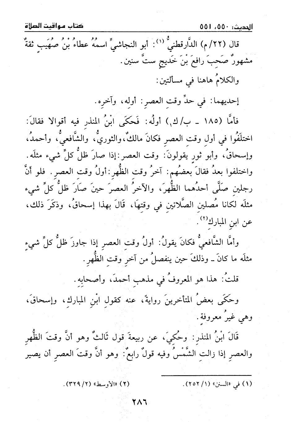 اختلفوا في اول وقت العصر: فكان مالك والثوري والشافعي وأحمد وإسحاق وابو ثور يقولون: وقت الظهر إذا صار ظل كل شيء مثله.