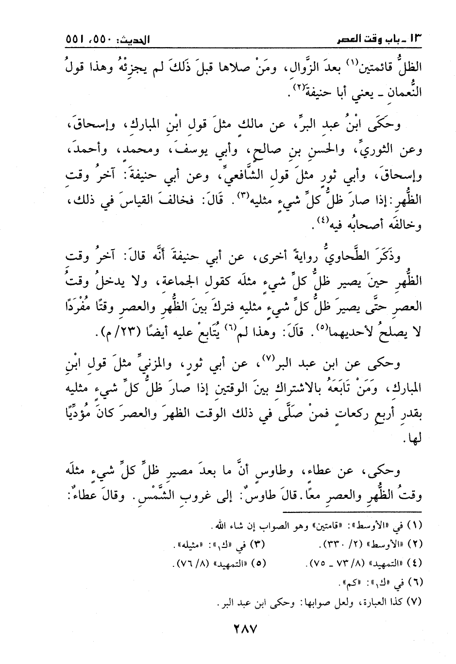 وحكى ابن عبد البر، عن مالك مثل قول ابن المبارك وإسحاق، وعن الثوري والحسن بن صالح وأبي يوسف ومحمد وأحمد وإسحاق وأبي ثور مثل قول الشافعي، وعن أبي حنيفة: آخر وقت الظهر إذا صار ظل كل شيء مثليه.