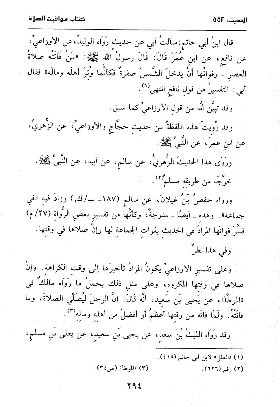قال ابن أبي حاتم: سألت أبي عن حديث رواه الوليد، عن الأوزاعي، عن نافع، عن ابن عمر، قال: قال رسول الله - صَلَّى اللهُ عَلَيْهِ وَسَلَّمَ -: ((من فاتته صلاة العصر - وفواتها: أن تدخل الشمس صفرةٌ - فكأنما وتر أهله وماله)) ؟ فقال أبي: التفسير من قول نافع. انتهى.