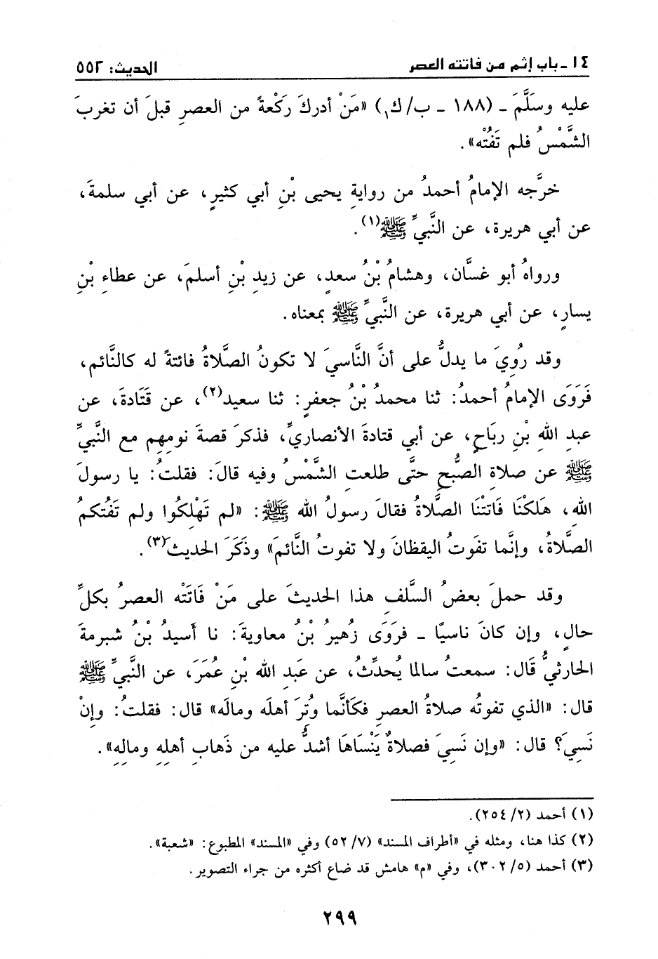 فروى زهير بن معاوية: نا أسيد بن شبرمة الحارثي، قال: سمعت سالما يحدث عن عبد الله بن عمر، عن النبي - صَلَّى اللهُ عَلَيْهِ وَسَلَّمَ -، قال: ((الذي تفوته صلاة العصر فكأنما وتر أهله وماله)) قال: فقلت: وإن نسي؟ قال: وإن نسي، فصلاة ينساها أشد عليه من ذهاب أهله وماله.