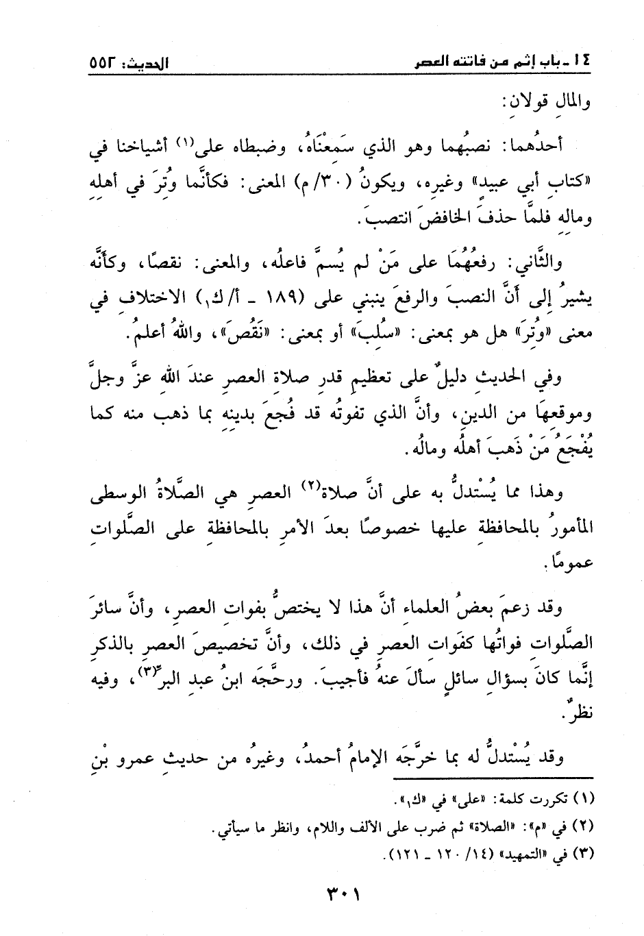 وقد زعم بعض العلماء: أن هذا لا يختص بفوات العصر، وأن سائر الصلوات فواتها كفوات العصر في ذلك، وأن تخصيص العصر بالذكر إنما كان بسؤال سائل سأل عنه فأجيب، ورجحه ابن عبد البر، وفيه نظر.