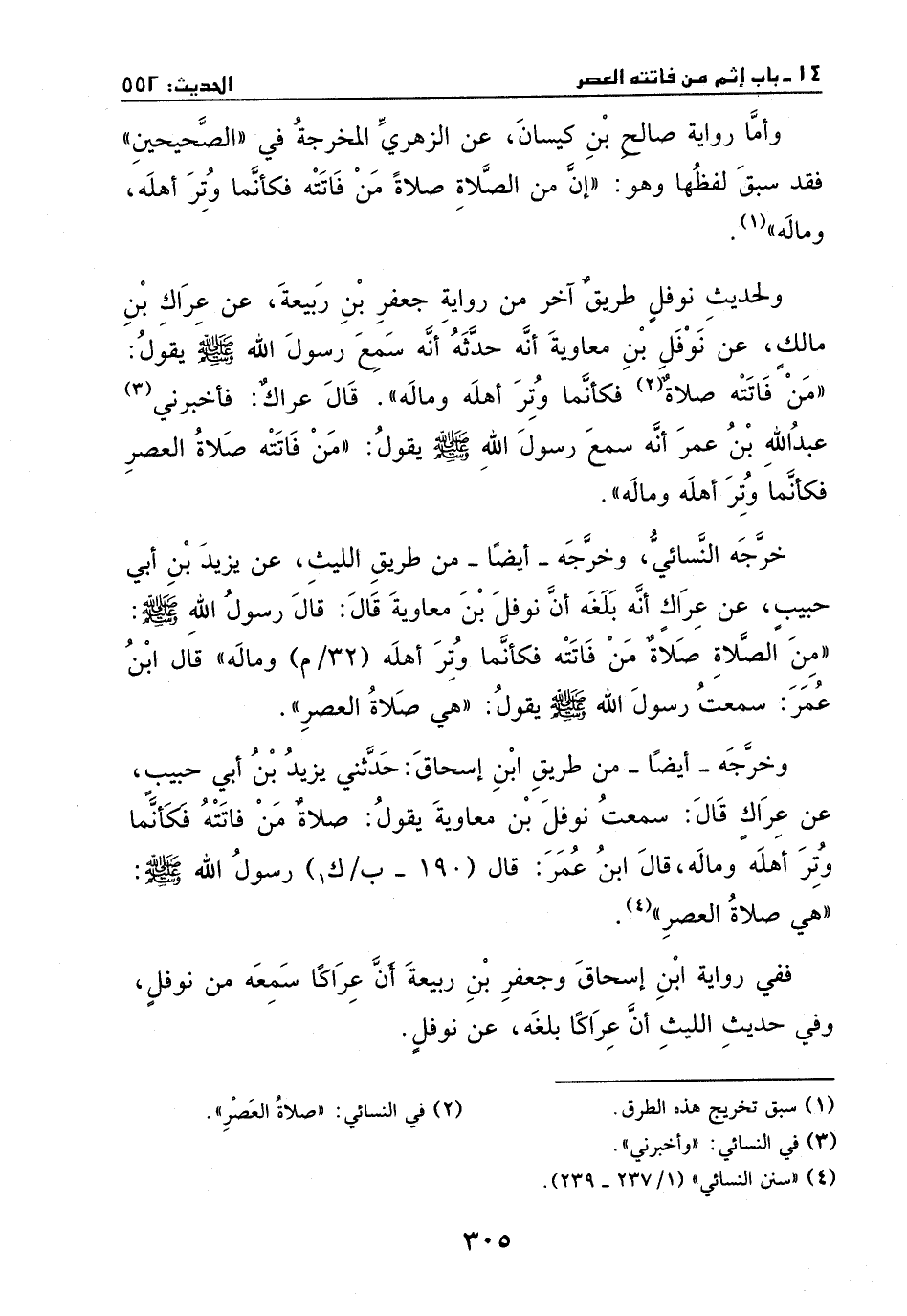 ولحديث نوفل طريق آخر: من رواية جعفر بن ربيعة، عن عراك بن مالك، عن نوفل بن معاوية، أنه حدثه، أنه سمع رسول الله - صَلَّى اللهُ عَلَيْهِ وَسَلَّمَ - يقول: " من فاتته صلاةٌ فكأنما وتر أهله وماله". قال عراك: فأخبرني عبد الله بن عمر انه سمع رسول الله - صَلَّى اللهُ عَلَيْهِ وَسَلَّمَ - يقول: " من فاتته صلاة العصر فكأنما وتر اهله وماله".