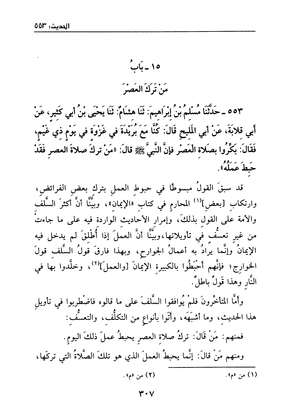 553 - حدثنا مسلم بن إبراهيم ثنا هشام: أبنا يحيى بن أبي كثير، عن أبي قلابة، عن أبي المليح، قال: كنا مع بريدة في غزوة في يوم ذي غيم، فقال: بكروا بصلاة العصر؛ فإن النبي - صَلَّى اللهُ عَلَيْهِ وَسَلَّمَ - قال: "من ترك صلاة العصر فقد حبط عمله".