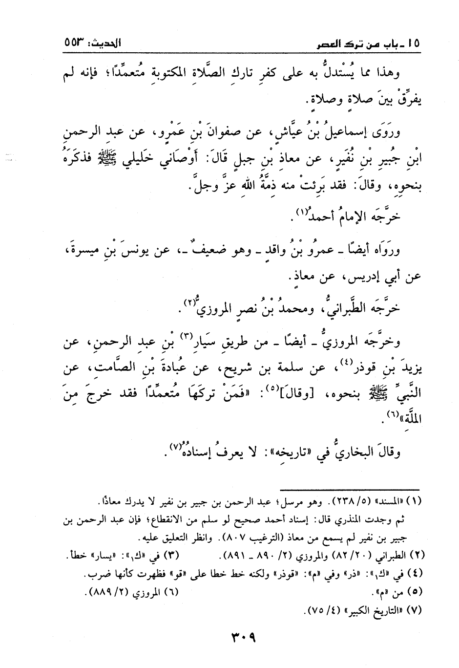 وخرجه المروزي - أيضا - من طريق سيار بن عبد الرحمن، عن يزيد بن قوذر، عن سلمة بن شريح، عن عبادة بن الصامت، عن النبي - صَلَّى اللهُ عَلَيْهِ وَسَلَّمَ - بنحوه، وقال: " فمن تركها متعمداً فقد خرج من الملة".