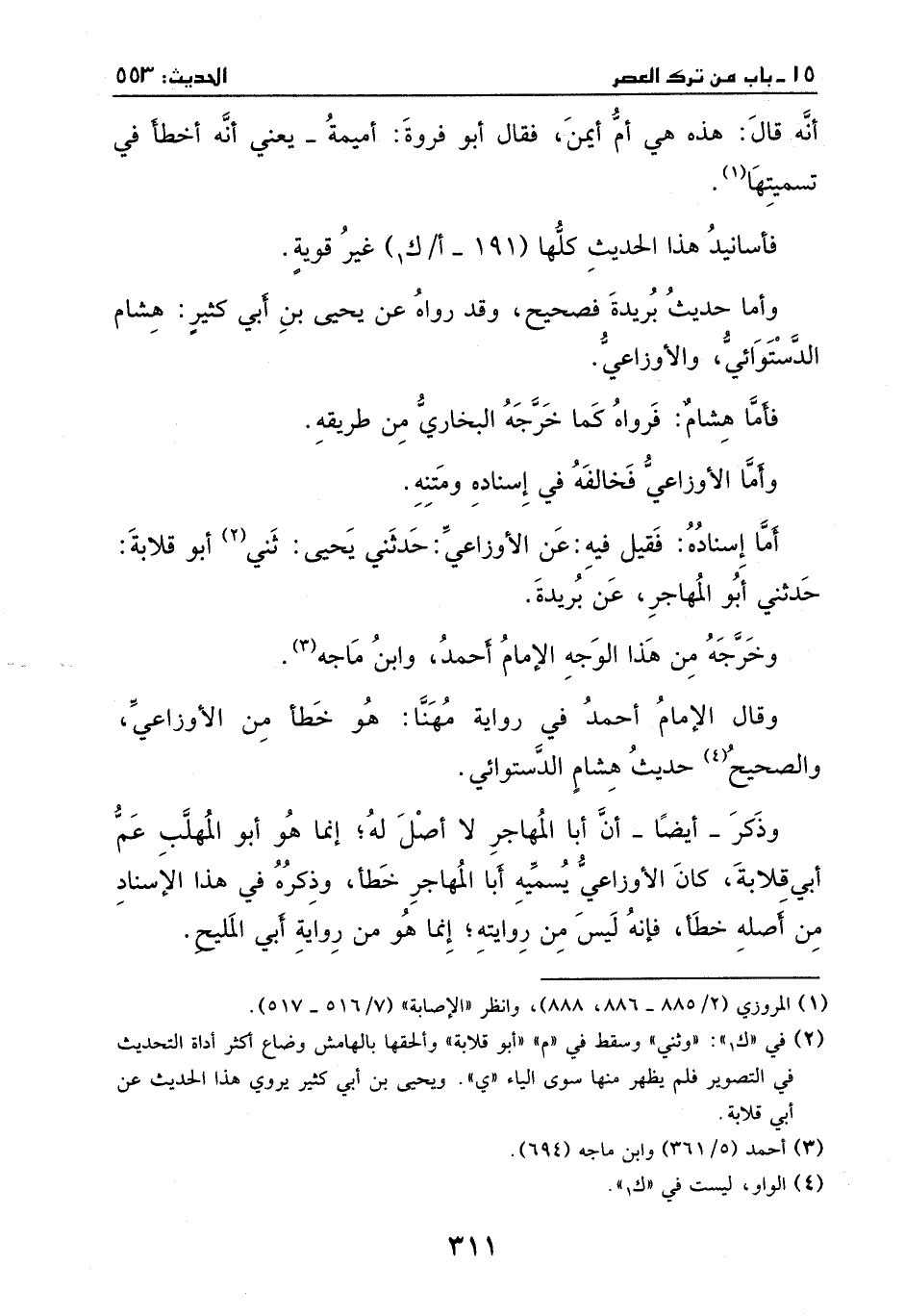 وقال الإمام أحمد في رواية مهنا: هو خطأ من الأوزاعي، والصحيح حديث هشام الدستوائي. وذكر – أيضا - أن أبا المهاجر لا أصل له، إنما هو أبو المهلب عم أبي قلابة، كان الأوزاعي يسميه أبا المهاجر خطأ، وذكره في هذا الإسناد من أصله خطأ، فإنه ليس من روايته، إنما هو من رواية أبي المليح،