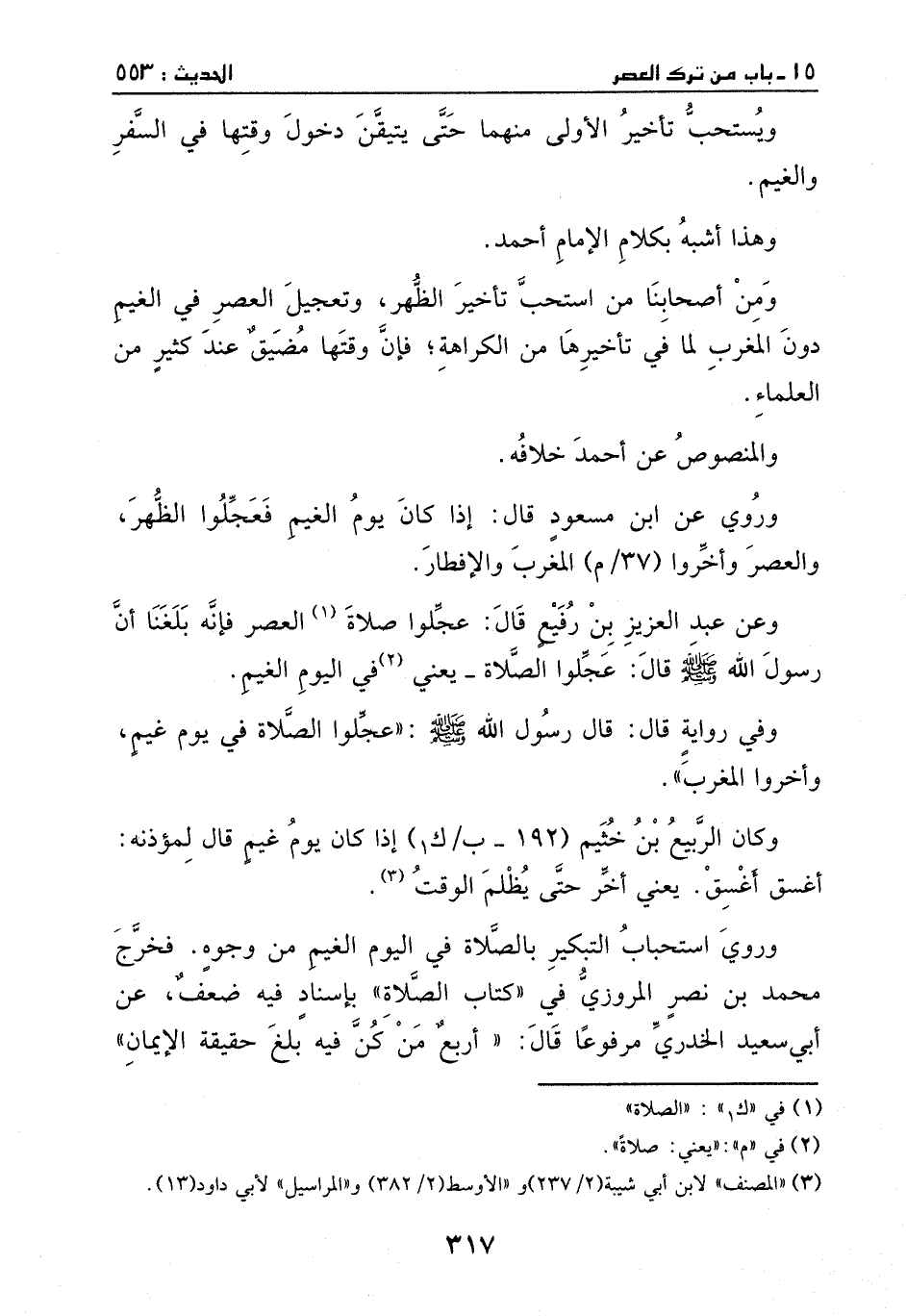وعن عبد العزيز بن رفيع، قال: عجلوا صلاة العصر؛ فإنه بلغنا ان رسول الله - صَلَّى اللهُ عَلَيْهِ وَسَلَّمَ - قال: " عجلوا الصلاة" –يعني: صلاة في اليوم الغيم.