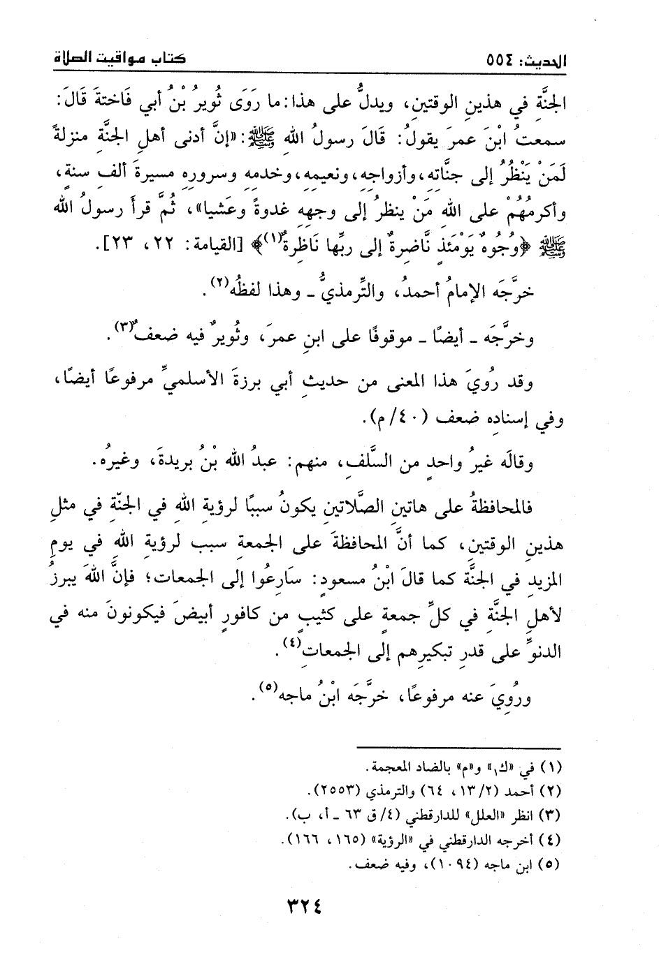 فالمحافظة على هاتين الصلاتين تكون سبباً لرؤية الله في الجنة في مثل هذين الوقتين، كما أن المحافظة على الجمعة سبب لرؤية الله في يوم المزيد في الجنة، كما قال ابن مسعود: سارعوا إلى الجمعات؛ فإن الله يبرز لأهل الجنة في كل جمعة على كثيب من كافور أبيض، فيكونون منه في الدنو على قدر تبكيرهم إلى الجمعات.