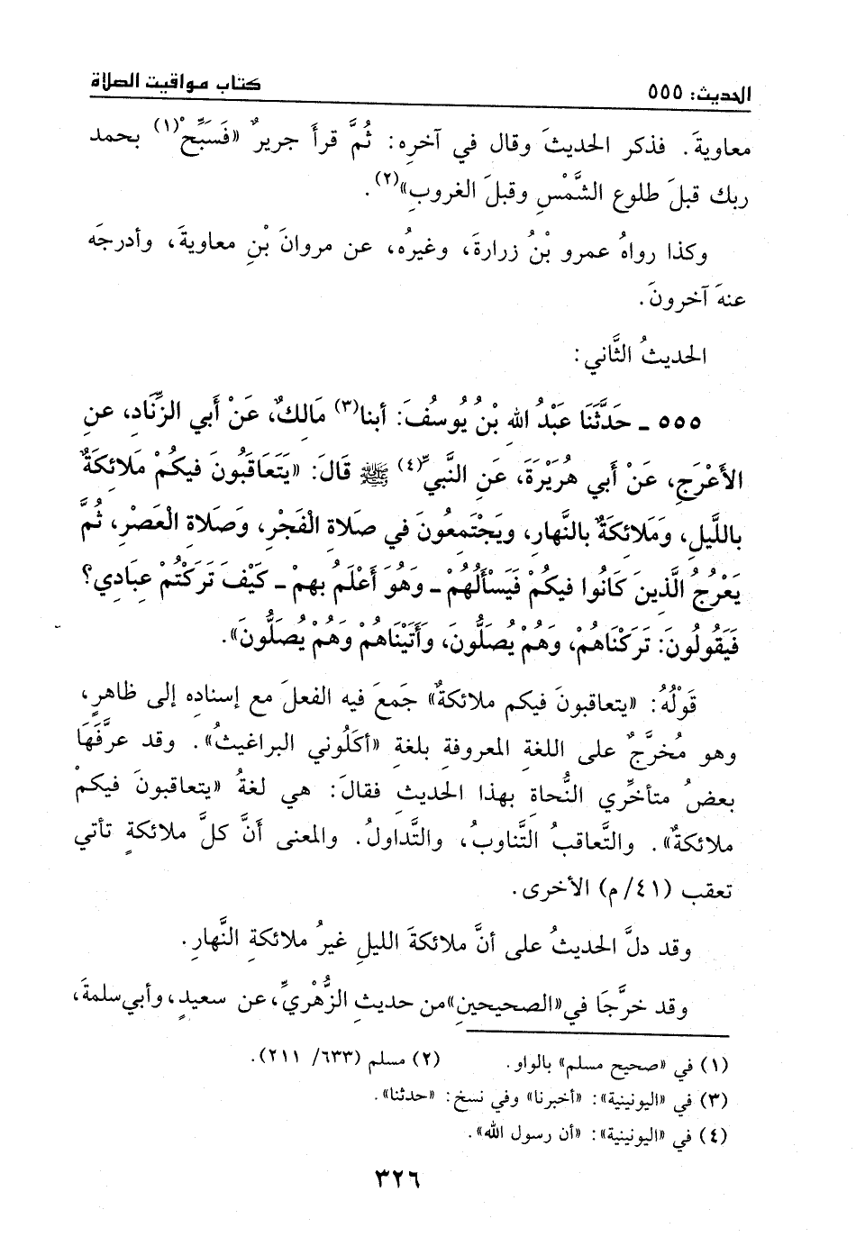 555 - حدثنا عبد الله بن يوسف: أبنا مالك، عن أبي الزناد، عن الأعرج، عن أبي هريرة، عن النبي ? - صَلَّى اللهُ عَلَيْهِ وَسَلَّمَ -، قال: " يتعاقبون فيكم ملائكة بالليل، وملائكة بالنهار، ويجتمعون في صلاة الفجر وصلاة العصر، ثم يعرج الذين كانوا فيكم، فيسألهم – وهو أعلم بهم -: كيف تركتم عبادي؟ فيقولون: تركناهم وهم يصلون، وأتيناهم وهم يصلون".