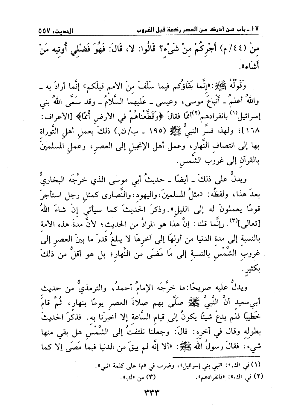 ويدل على ذلك - أيضا -: حديث أبي موسى الذي خرجه البخاري بعد هذا، ولفظه: " مثل المسلمين واليهود والنصارى كمثل رجل أستأجر قوما يعملون له إلى الليل" - وذكر الحديث، كما سيأتي - إن شاء الله.