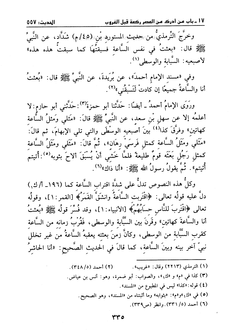 وروى الإمام أحمد –أيضا: ثنا أبو ضمرة: حدثني أبو حازم، لا أعلمه إلا عن سهل بن سعد، عن النبي - صَلَّى اللهُ عَلَيْهِ وَسَلَّمَ -، قال: " مثلي ومثل الساعة كهاتين" - وفرق كذا بين أصبعيه الوسطى والتي تلي الإبهام، ثم قال: " مثلي ومثل الساعة كمثل فرسي رهان"، ثم قال: "مثلي ومثل الساعة كمثل رجل بعثه قومه طليعة، فلما خشي أن يسبق الاح بثوبه أتيتم أتيتم". ثم يقول رسول الله - صَلَّى اللهُ عَلَيْهِ وَسَلَّمَ -: " أنا ذاك".