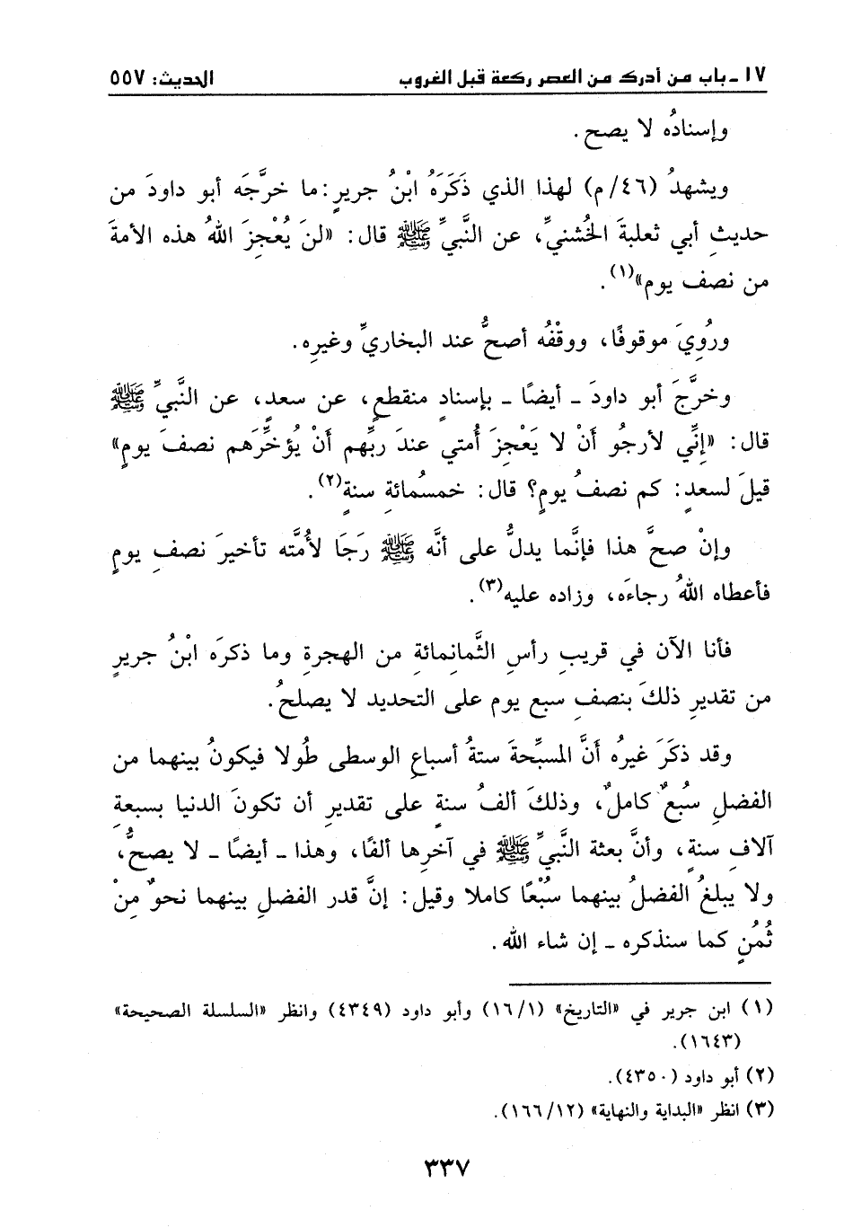 ويشهد لهذا الذي ذكره ابن جرير: ما خرجه أبو داود من حديث أبي ثعلبة الخشني، عن النبي - صَلَّى اللهُ عَلَيْهِ وَسَلَّمَ -، قال: " لن يعجز الله هذه الأمة من نصف يوم".