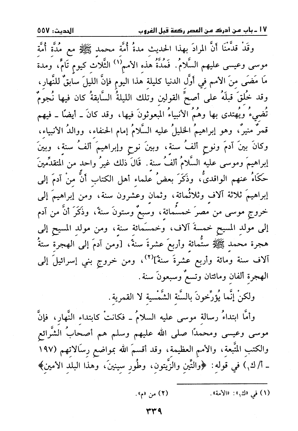 وذكر بعض علماء أهل الكتاب أن من آدم إلى إبراهيم ثلاثة آلاف وثلاثمائة وثمان وعشرون سنة، ومن إبراهيم إلى خروج موسى من مصر خمسمائة وسبع وستون سنة، وذكر إن من آدم إلى مولد المسيح خمسة آلاف وخمسمائة سنة، ومن مولد المسيح إلى هجرة محمد - صَلَّى اللهُ عَلَيْهِ وَسَلَّمَ - ستمائة وأربع عشر سنة، ومن آدم إلى الهجرة ستة آلاف سنة ومائة وأربع عشرة سنة، ومن خروج بني أسرائيل إلى الهجرة ألفان ومائتان وتسع وسبعون سنة، ولكن إنما يؤرخون بالسنة الشمسية لا القمرية.