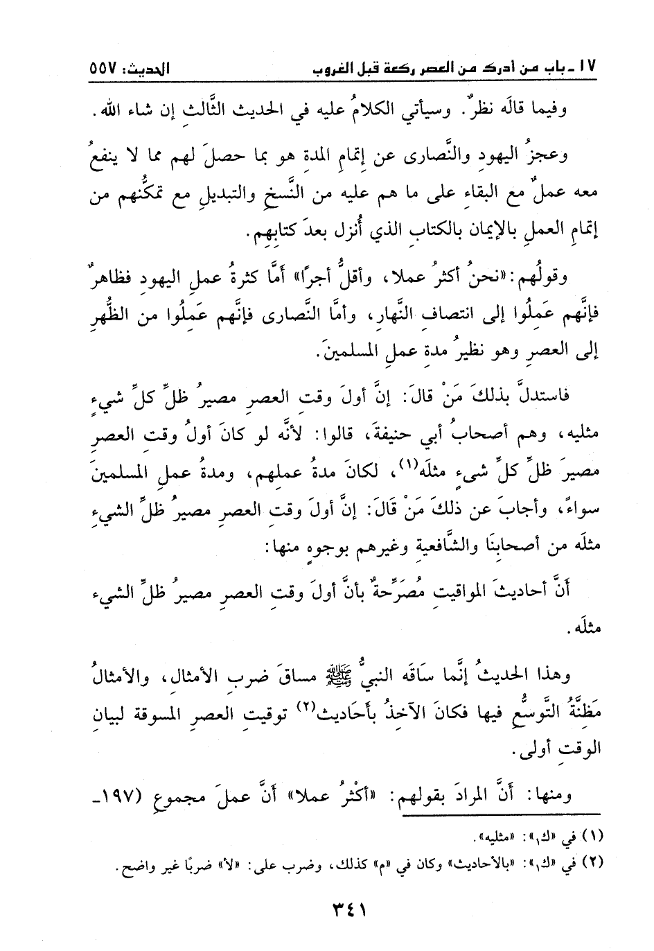 فاستدل بذلك من قال: إن أول وقت العصر مصير كل شيء مثليه، وهم أصحاب أبي حنفية، قالوا: لأنه لو كان أول وقت العصر مصير ظل كل شيء مثله لكان مدة عملهم ومدة عمل المسلمين سواء.