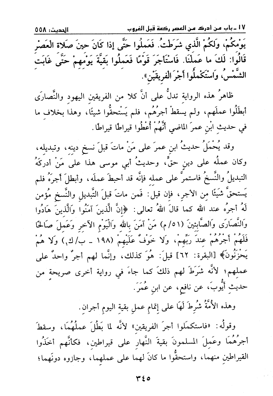 ظاهر هذه الرواية: يدل على أن كلاً من الفريقين اليهود والنصارى أبطلوا عملهم ولم يسقطوا أجرهم فلم يستحقوا شيئاً، وهذا بخلاف ما في حديث ابن عمر الماضي أنهم أعطوا قيراطاً قيراطاً.