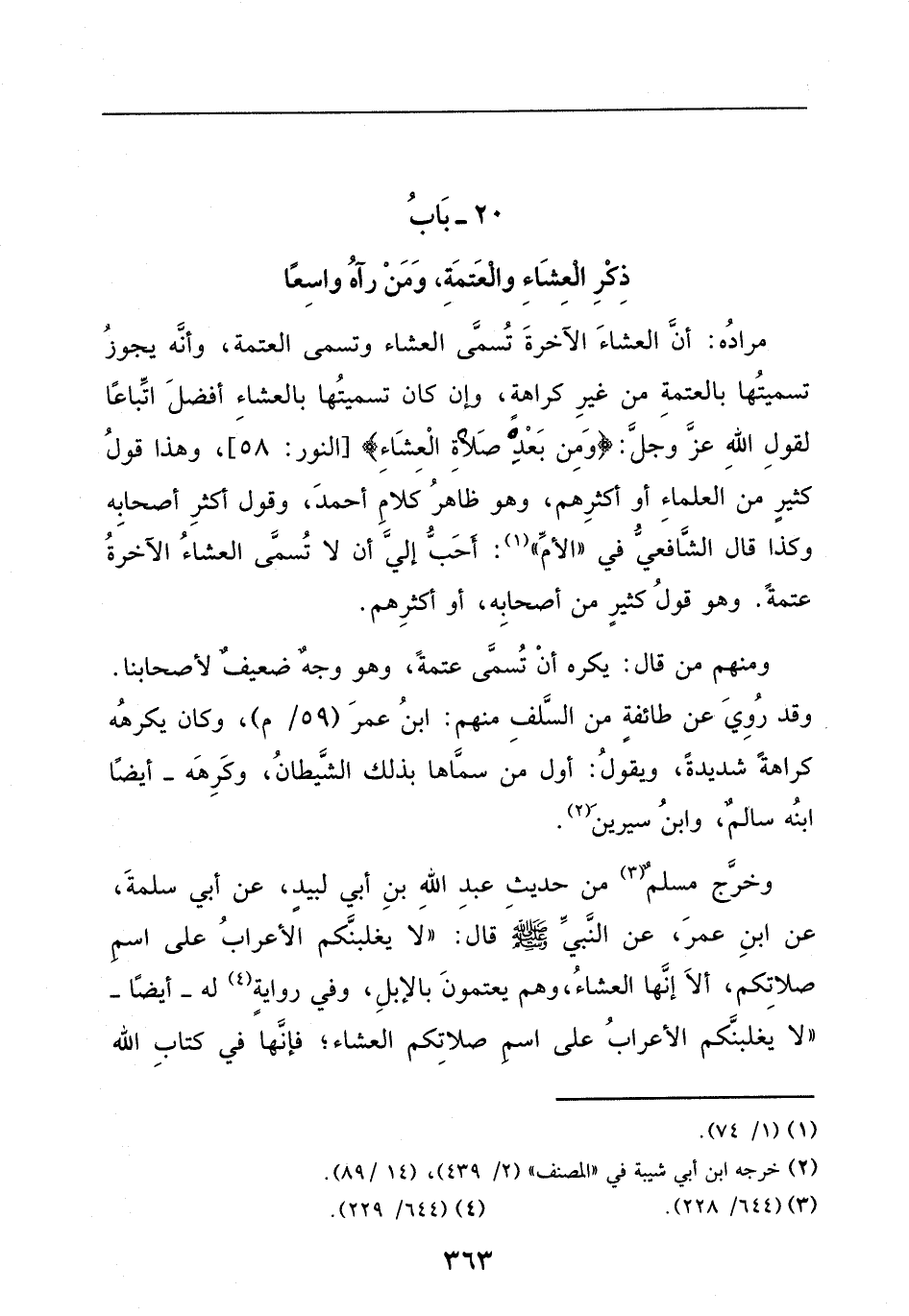 مراده: أن العشاء الآخرة تسمى العشاء، وتسمى العتمة، وأنه يجوز تسميتها بالعتمة من غير كراهة، وإن كان تسميتها بالعشاء أفضل اتباعاً لقول الله عز وجل: