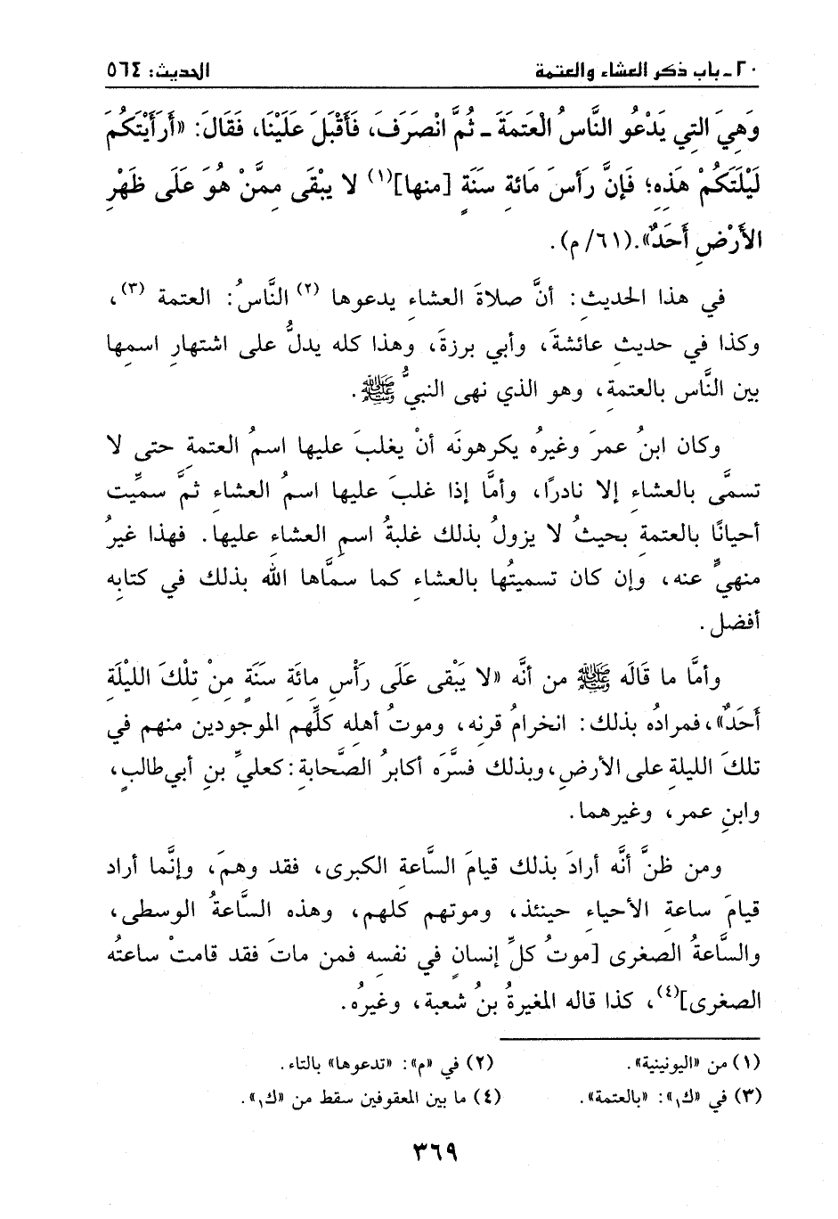 وهي التي يدعو الناس العتمة -، ثم أنصرف فأقبل علينا، فقال: ((أرأيتكم ليلتكم هذه، فإن راس مائة سنة [منها] لا يبقى ممن هو على ظهر الأرض أحد)) .