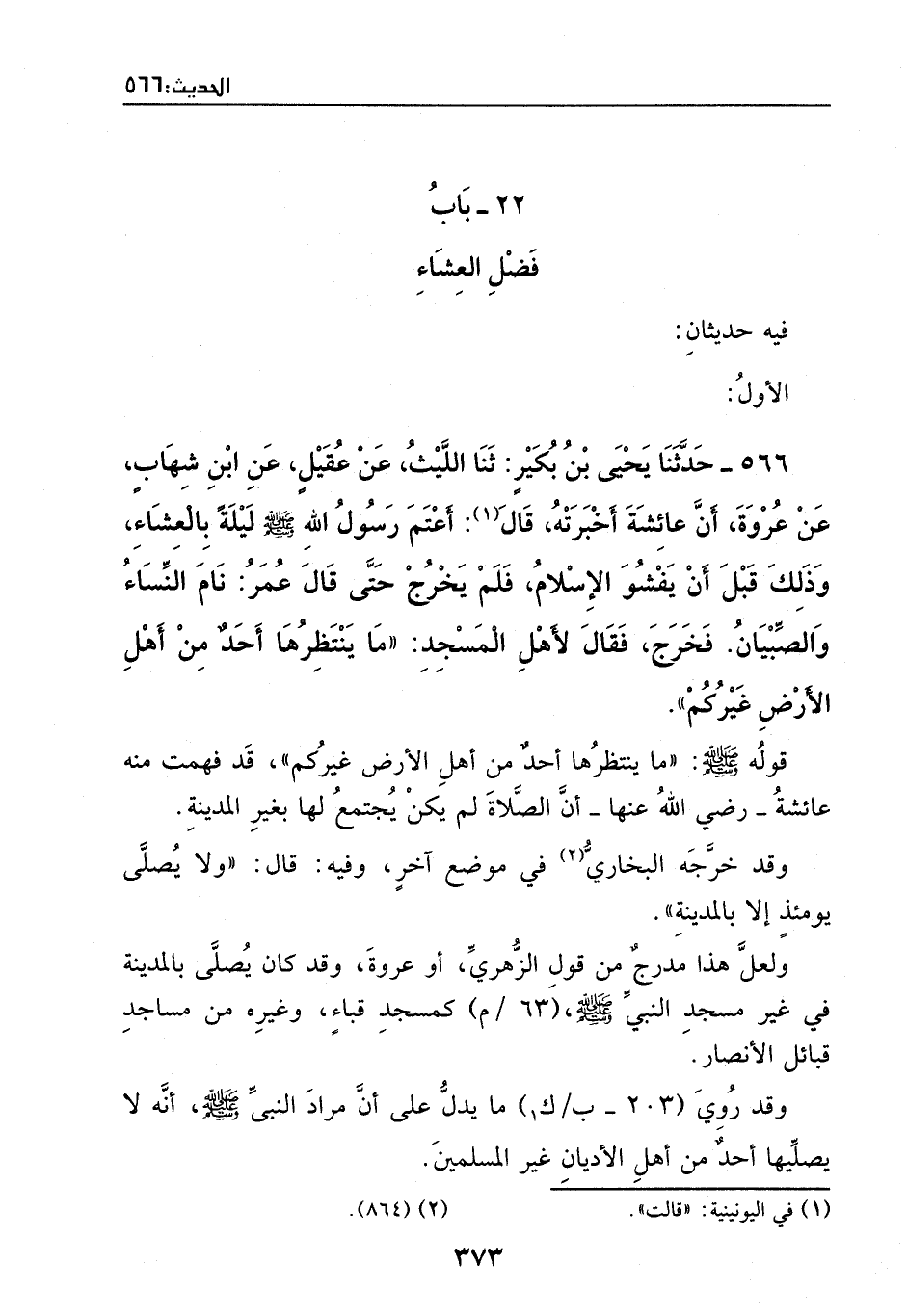 566 - حدثنا يحيى بن بكير: ثنا الليث، عن عقيل، عن ابن شهاب، عن عروة، أن عائشة أخبرته، قالت: أعتم رسول الله - صَلَّى اللهُ عَلَيْهِ وَسَلَّمَ - ليلة بالعشاء، وذلك قبل أن يفشو الإسلام، فلم يخرج حتى قال عمر: نام النساء والصبيان، فخرج، فقال لأهل المسجد: (ما ينتظرها أحد من أهل الأرض غيركم) .