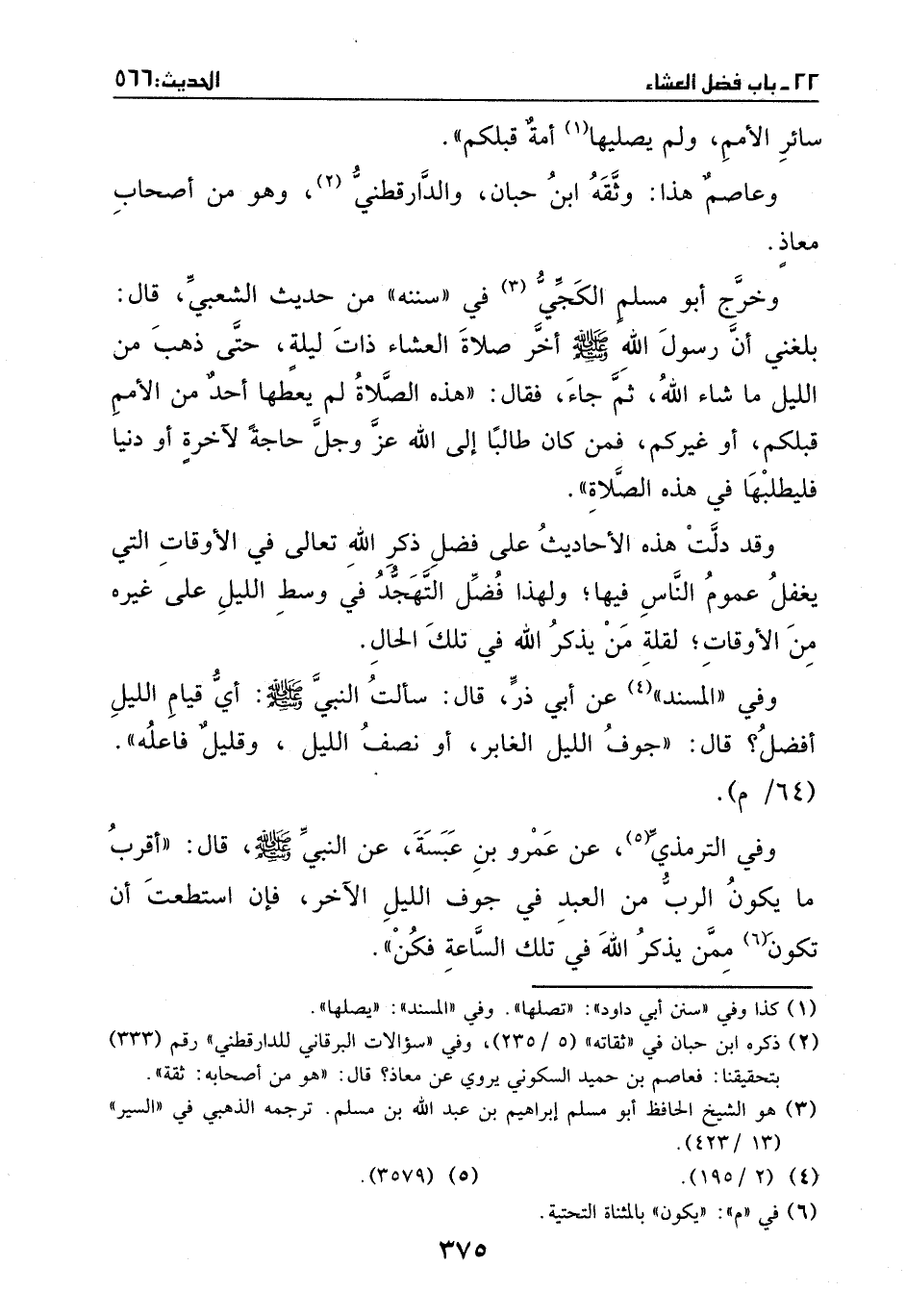 وخرج أبو مسلم الكجي في (سننه) من حديث الشعبي، قال: بلغني أن رسول الله - صَلَّى اللهُ عَلَيْهِ وَسَلَّمَ - أخر صلاة العشاء ذات ليلة حتى ذهب من الليل ما شاء الله، ثم جاء، فقال: (هذه الصلاة لم يعطها أحد من الأمم قبلكم – أو غيركم - فمن كان طالباً إلى الله عز وجل حاجة لآخرة أو دنيا فليطلبها في هذا الصلاة) .