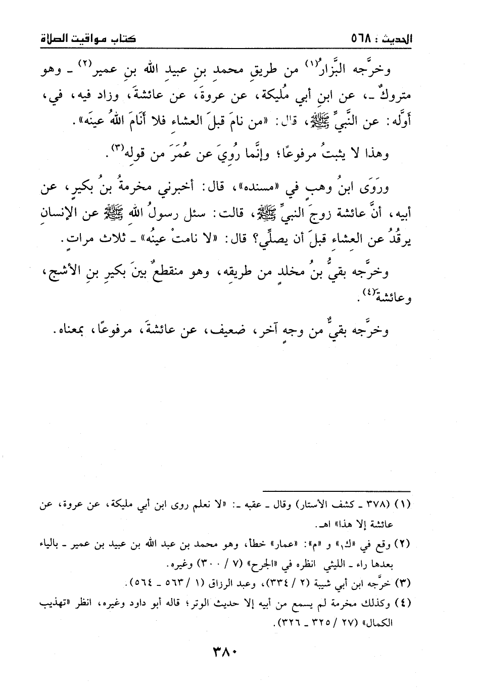 وخرجه البزار من طريق محمد بن عبد الله بن عبيد بن عمير – وهو متروك -، عن ابن أبي مليكة، عن عروة، عن عائشة – وزاد فيه، في أوله: عن النبي - صَلَّى اللهُ عَلَيْهِ وَسَلَّمَ -، قال: (من نام قبل العشاء فلا أنام الله عينه) .