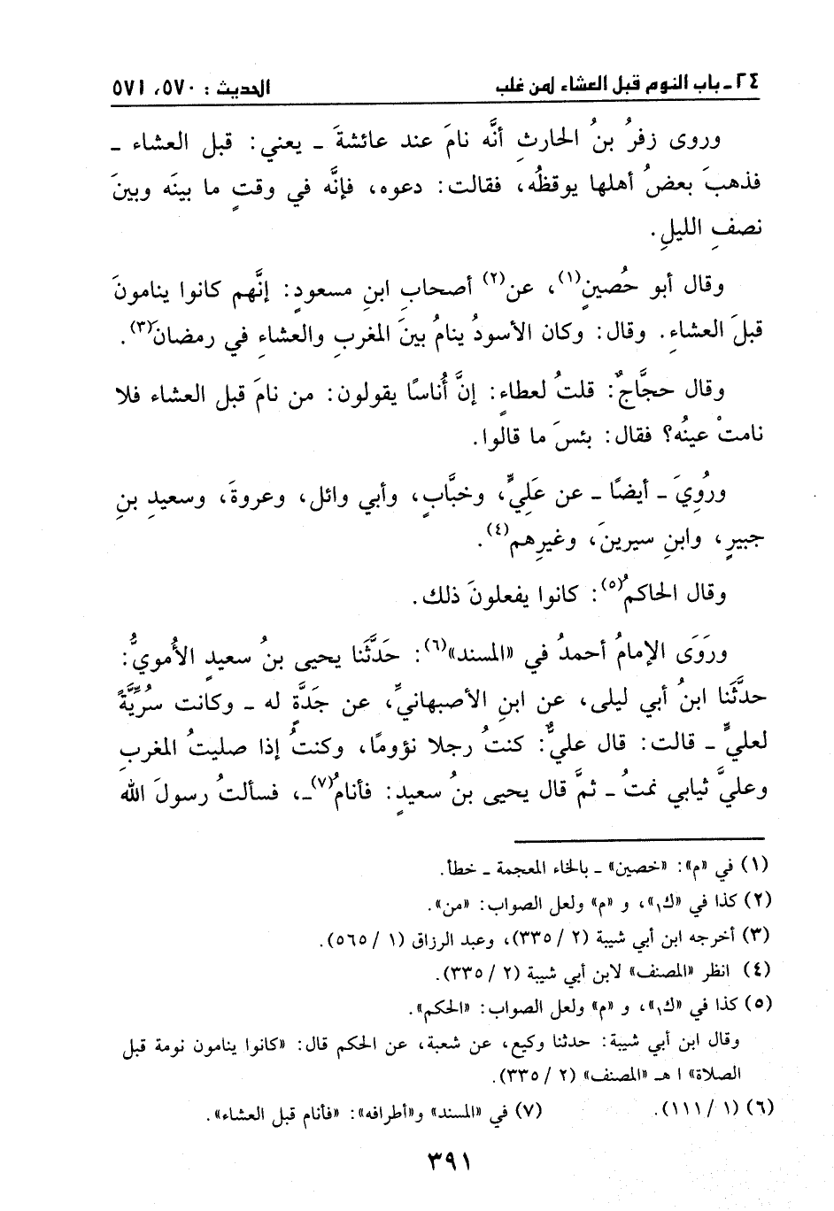 وروى الإمام أحمد في (المسند) : ثنا يحيى بن سعيد الأموي، حدثنا ابن أبي ليلى، عن ابن الأصبهاني، عن جدةٍ له – وكانت سرية لعلي -، قالت: قال علي: كنت رجلاً نئوماً، وكنت إذا صليت المغرب وعلي ثيأبي نمت – ثم قال يحيى بن سعيد: فأنام -، فسألت رسول الله - صَلَّى اللهُ عَلَيْهِ وَسَلَّمَ -