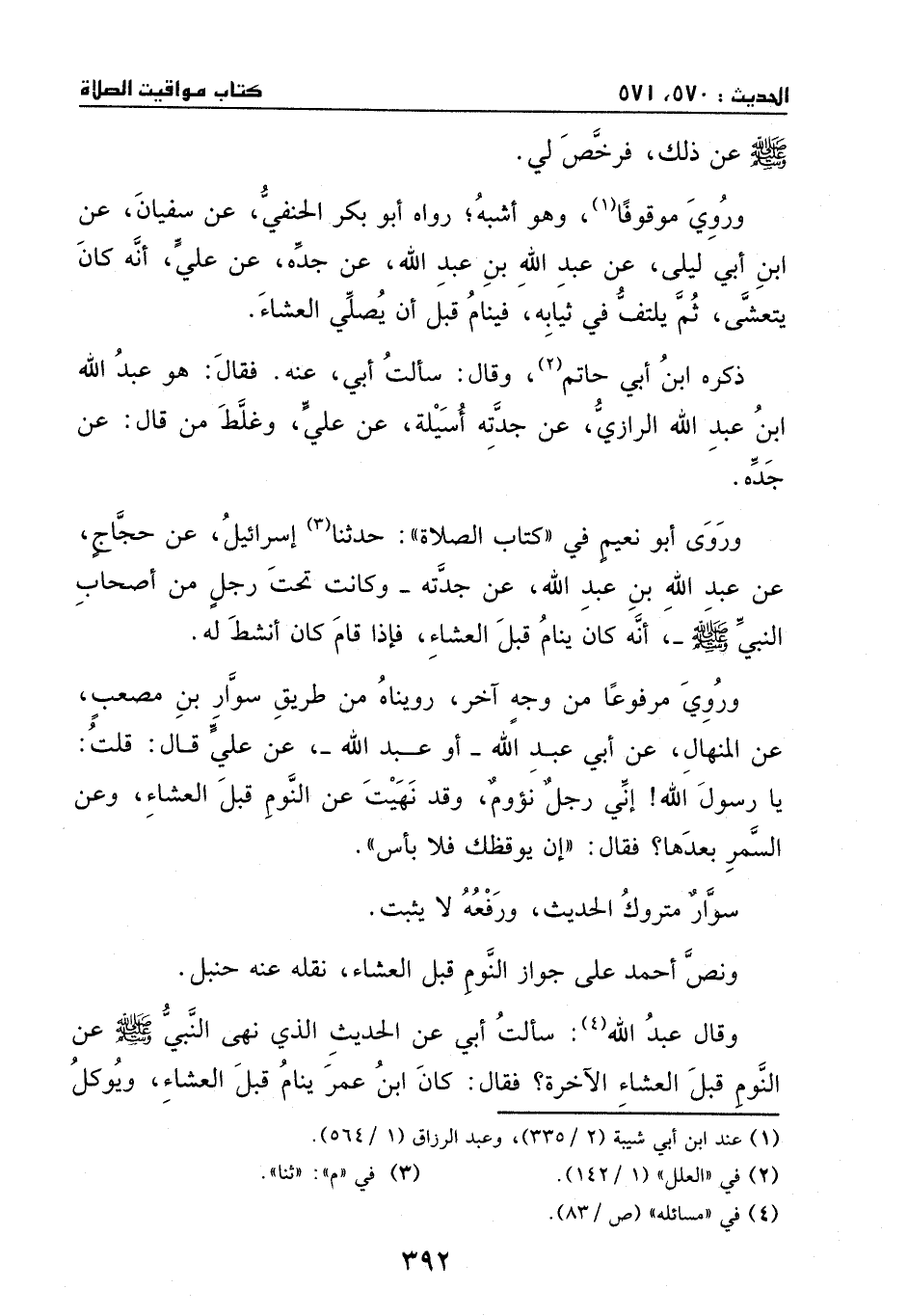 وقال عبد الله: سألت أبي عن الحديث الذي نهى النبي - صَلَّى اللهُ عَلَيْهِ وَسَلَّمَ - عن النوم قبل العشاء الآخرة؟ فقال: كان ابن عمر ينام قبل العشاء ويوكل