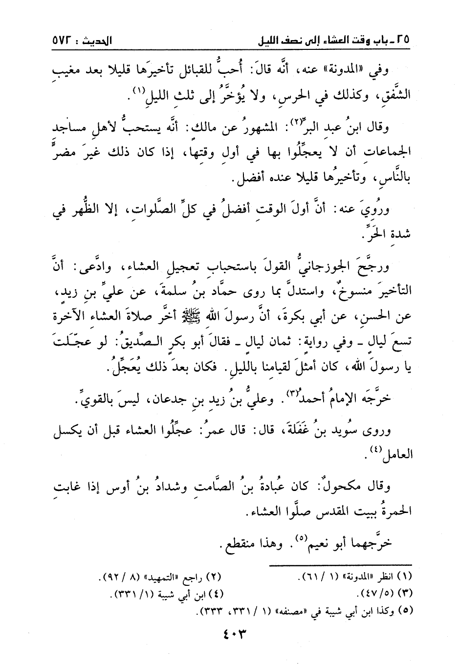 وفي (المدونة) عنه: أنه قال: أحب للقبائل تأخيرها قليلاً بعد مغيب الشفق، وكذلك في الحرس، ولا تؤخر إلى ثلث الليل.