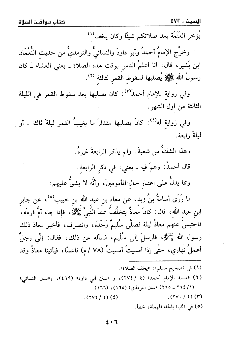 وخرج الإمام أحمد وأبو داود والنسائي والترمذي من حديث النعمان بن بشير، قال: أنا أعلم الناس بوقت هذه الصلاة – يعني: العشاء -، كان رسو الله - صَلَّى اللهُ عَلَيْهِ وَسَلَّمَ - يصليها لسقوط القمر لثالثة.