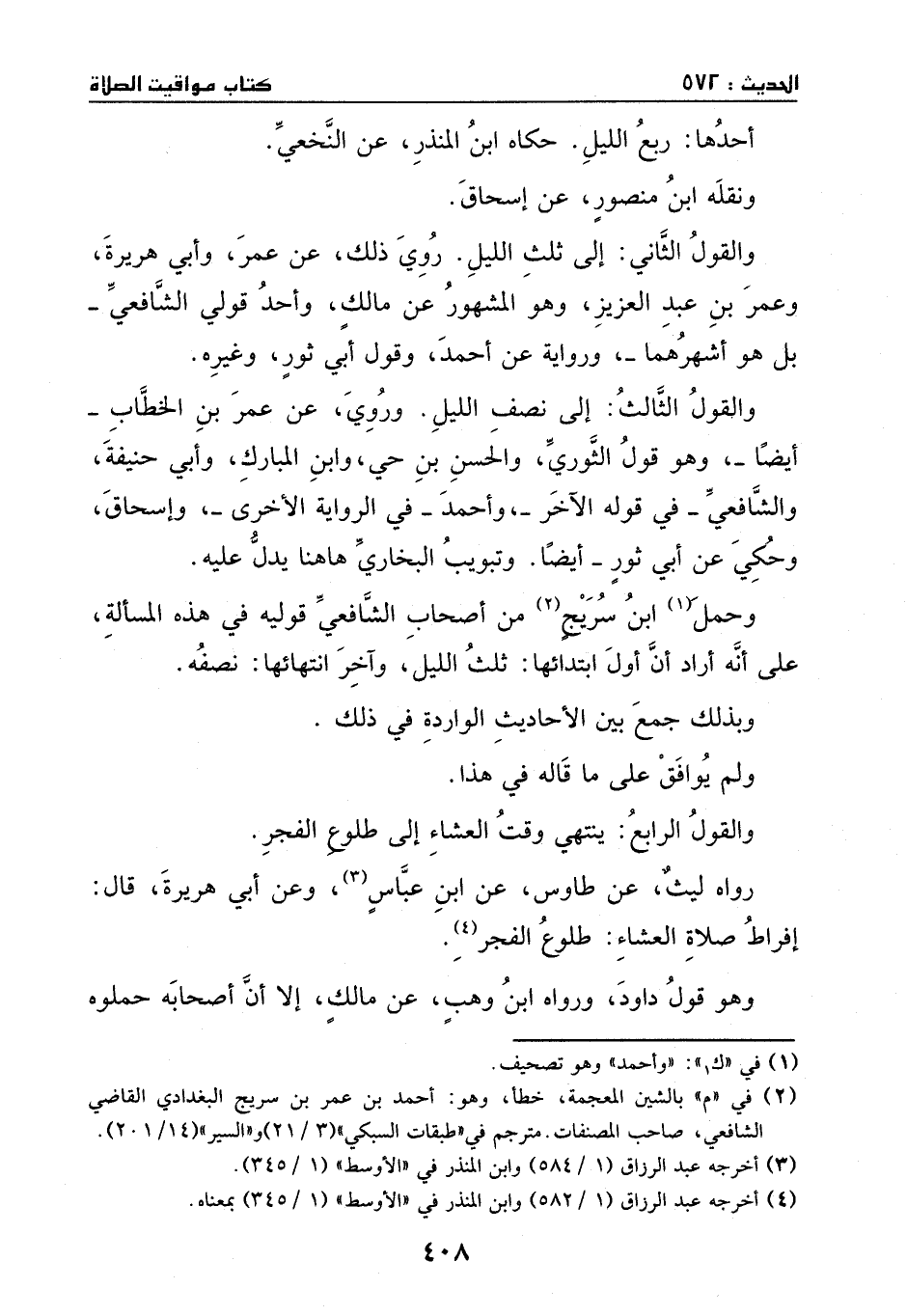 والقول الثالث: إلى نصف الليل، وروي عن عمر بن الخطاب – أيضا -، وهو قول الثوري والحسن بن حي وابن المبارك وأبي حنفية، والشافعي في قوله الآخر، وأحمد في الرواية الأخرى، وإسحاق، وحكي عن أبي ثور – أيضا.