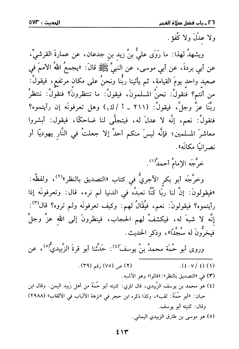 ويشهد لهذا: ما روى علي بن زيد بن جدعان، عن عمارة القرشي عن أبي بردة، عن أبي موسى، عن النبي - صَلَّى اللهُ عَلَيْهِ وَسَلَّمَ -، قال: (يجمع الله الأمم في صعيد واحد يوم القيامة، ثم يأتينا ربنا ونحن على مكان مرتفع فيقول: من أنتم؟ فنقول: نحن المسلمون. فيقول: ما تنتظرون. فنقول: ننتظر ربنا عز وجل، فيقول: وهل تعرفون إن رأيتموه؟ فنقول: نعم؛ إنه لا عدل له، فيتجلى لنا ضاحكاً، فيقول: أبشروا معاشر المسلمين؛ فإنه ليس منكم أحد إلا جعلت في النار يهودياً أو نصرانياً مكانه) .