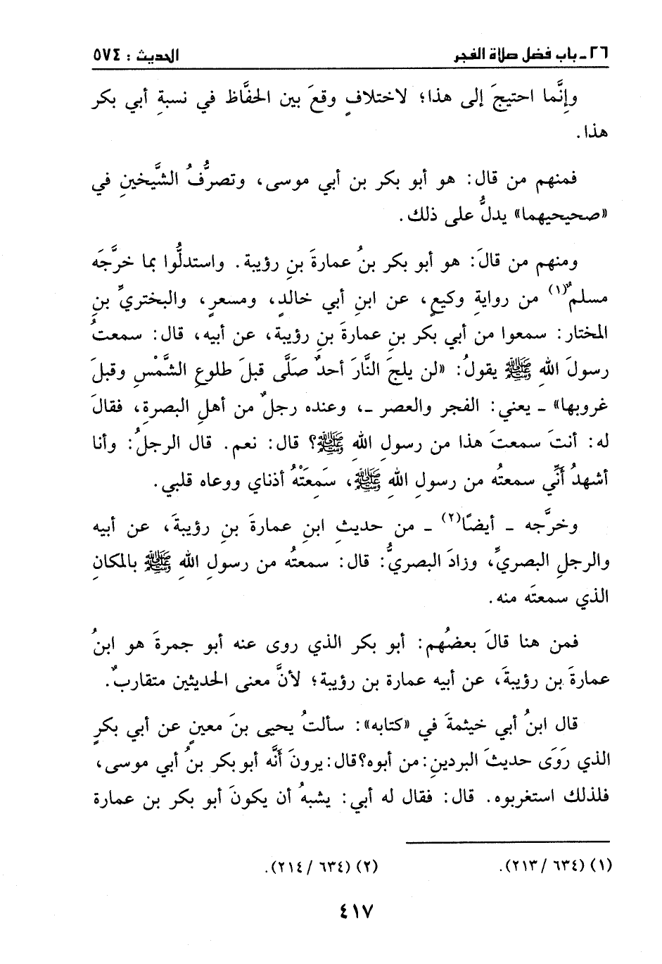 واستدلوا بما خرجه مسلم من رواية وكيع، عن ابن أبي خالد ومسعر والبختري بن المختار، سمعوا من أبي بكر بن عمارة بن رؤيبة، عن أبيه، قال: سمعت رسول الله - صَلَّى اللهُ عَلَيْهِ وَسَلَّمَ - يقول: (لن يلج النار أحد صلى قبل طلوع الشمس وقبل غروبها) – يعني: الفجر والعصر. وعنده رجل من أهل البصرة، فقال له: أنت سمعت هذا من رسول الله - صَلَّى اللهُ عَلَيْهِ وَسَلَّمَ -؟ قال: نعم. قال الرجل: وأنا أشهد أني سمعته من رسول الله - صَلَّى اللهُ عَلَيْهِ وَسَلَّمَ -، سمعته أذناي، ووعاه قلبي.