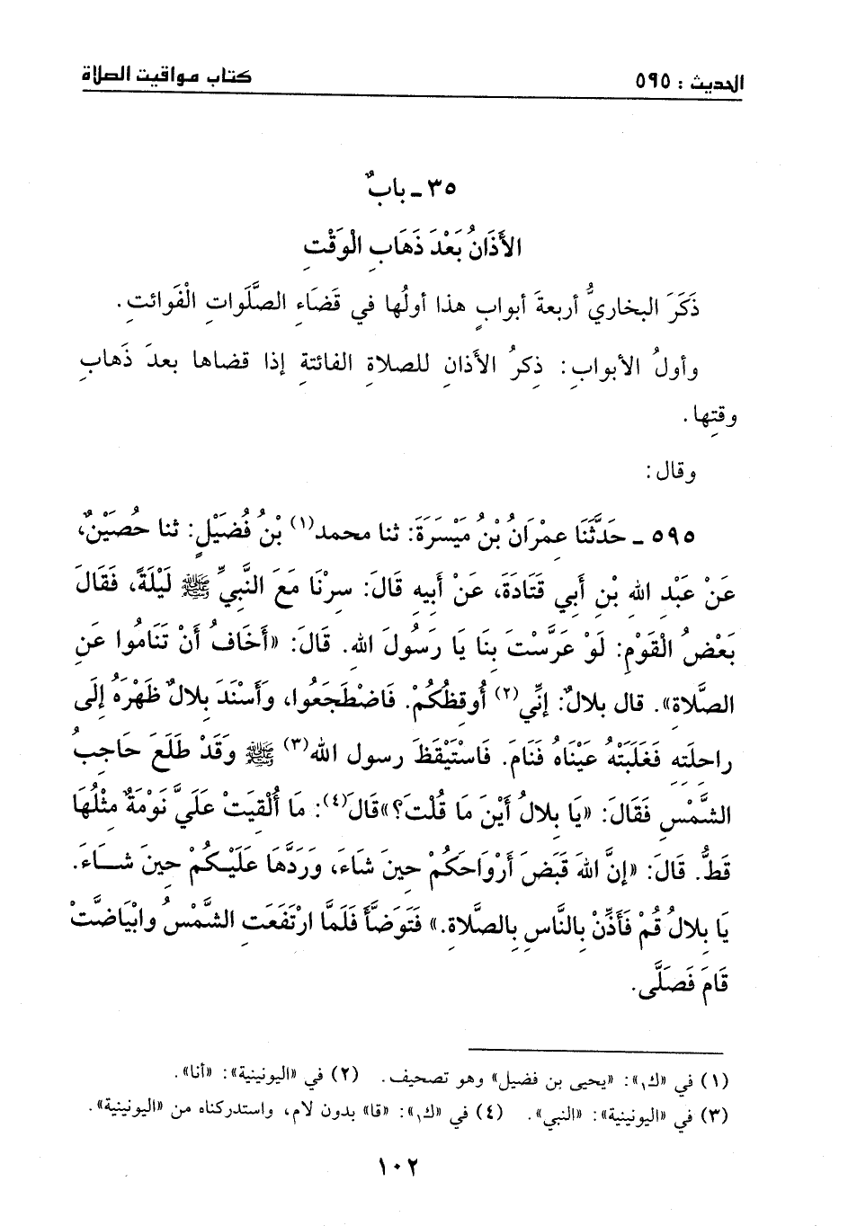 595 - حدثنا عمران بن ميسرة: ثنا محمد بن فضيل: ثنا حصين، عن عبد الله بن أبي قتادة، عن أبيه، قال: سرنا مع النبي - صَلَّى اللهُ عَلَيْهِ وَسَلَّمَ - ليلة، فقال بعض القوم: لو عرست بنا يا رسول الله. قال: (أخاف أن تناوموا عن الصلاة) . قال بلال: [إني] اوقظكم، فاضطجعوا، وأسند بلال ظهره إلى راحلته، فغلبته عيناه، فنام، فاستيقظ رسول الله - صَلَّى اللهُ عَلَيْهِ وَسَلَّمَ - وقد طلع حاجب الشمس، فقال: (يا بلال، أين ما قلت؟) قال: ما ألقيت علي نومة مثلها قط. قال: (إن الله قبض أرواحكم حين شاء، وردها عليكم حين شاء، يا بلال، قم فأذن بالناس بالصلاة) ، فتوضأ، فلما ارتفعت الشمس وأبياضت قام فصلى.