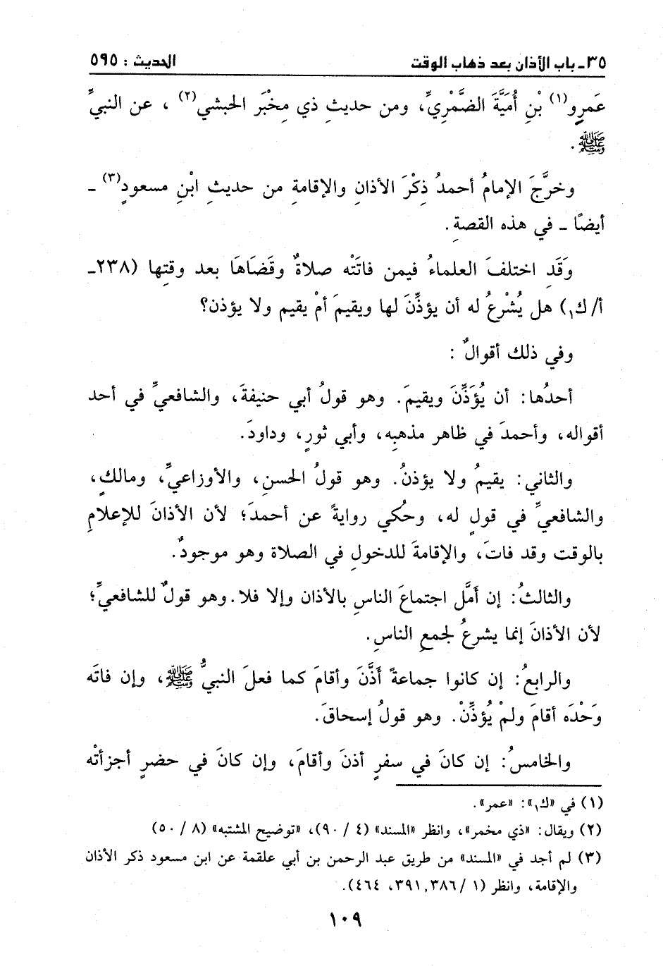 والرابع: إن كانوا جماعة أذن وأقام، كما فعل النبي - صَلَّى اللهُ عَلَيْهِ وَسَلَّمَ -، وإن فاته وحده أقام ولم يؤذن، وهو قول إسحاق.
