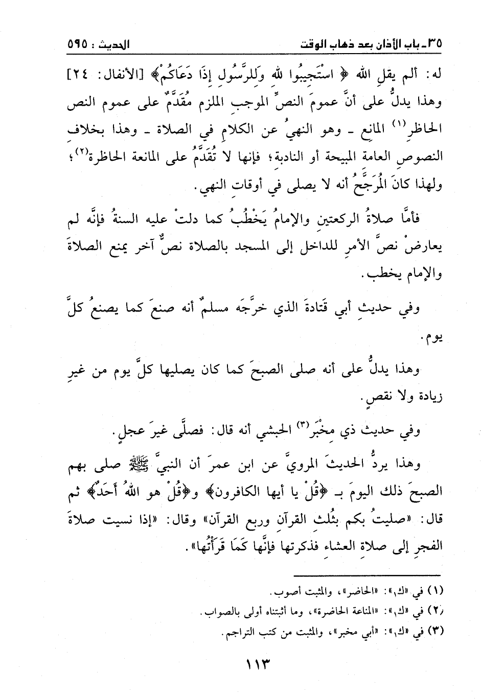 وهذا يدل على أن عموم النص الموجب الملزم مقدم على عموم النص الحاظر المانع، وهو النهي عن الكلام في الصلاة.