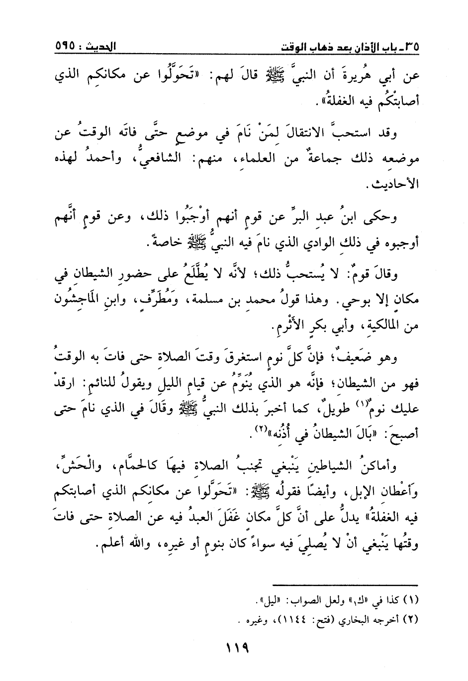 وقد استحب الانتقال لمن نام في موضع حتى فاته الوقت عن موضعه ذلك جماعة من العلماء، منهم: الشافعي وأحمد؛ لهذه الأحاديث.