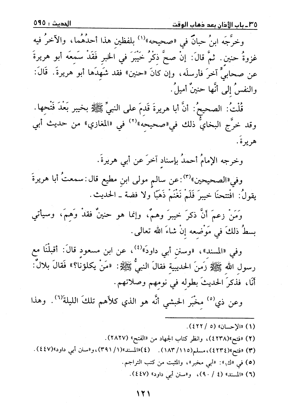 ثم قال: إن صح ذكر (خيبر) في الخبر، فقد سمعه أبو هريرة عن صحابي آخر فأرسله، وإن كان (حنين) ، فقد شهدها أبو هريرة. قال: والنفس إلى أنها حنين أميل