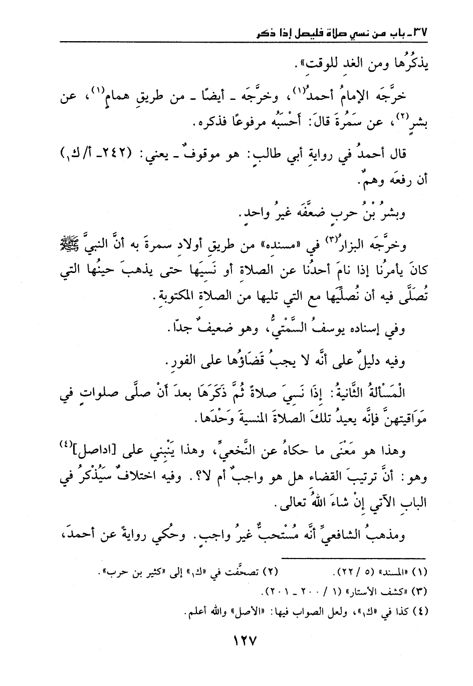 وخرجه البزار في (مسنده) من طريق أولاد سمرة، به، أن النبي - صَلَّى اللهُ عَلَيْهِ وَسَلَّمَ - كان يأمرنا إذا نام أحدنا عن الصلاة أو نسيها حتى يذهب حينها التي تصلى فيه أن نصليها مع التي تليها من الصلاة المكتوبة.