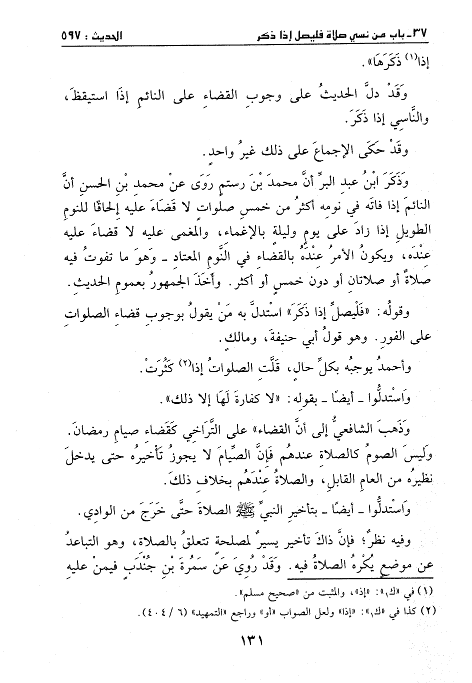 وذكر ابن عبد البر أن محمد بن رستم روى عن محمد بن الحسن، أن النائم إذا فاته في نومه أكثر من خمس صلوات لا قضاء عليه، إلحاقاً للنوم الطويل إذا زاد على يوم وليلة بالإغماء، والمغمى عليه لا قضاء عليه عنده، ويكون الأمر عنده بالقضاء في النوم المعتاد، وهو ما تفوت فيه صلاة أو صلاتان أو دون خمس أو أكثر.