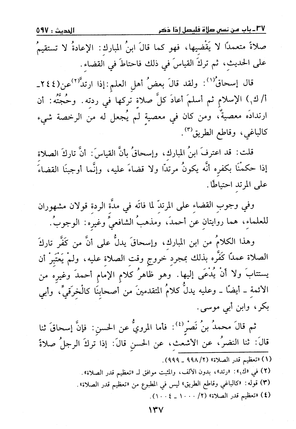 ثم قال محمد بن نصر: فأماالمروي عن الحسن، فإن إسحاق ثنا، قال: ثنا النضر، عن الاشعث، عن الحسن، قال: إذا ترك الرجل صلاة