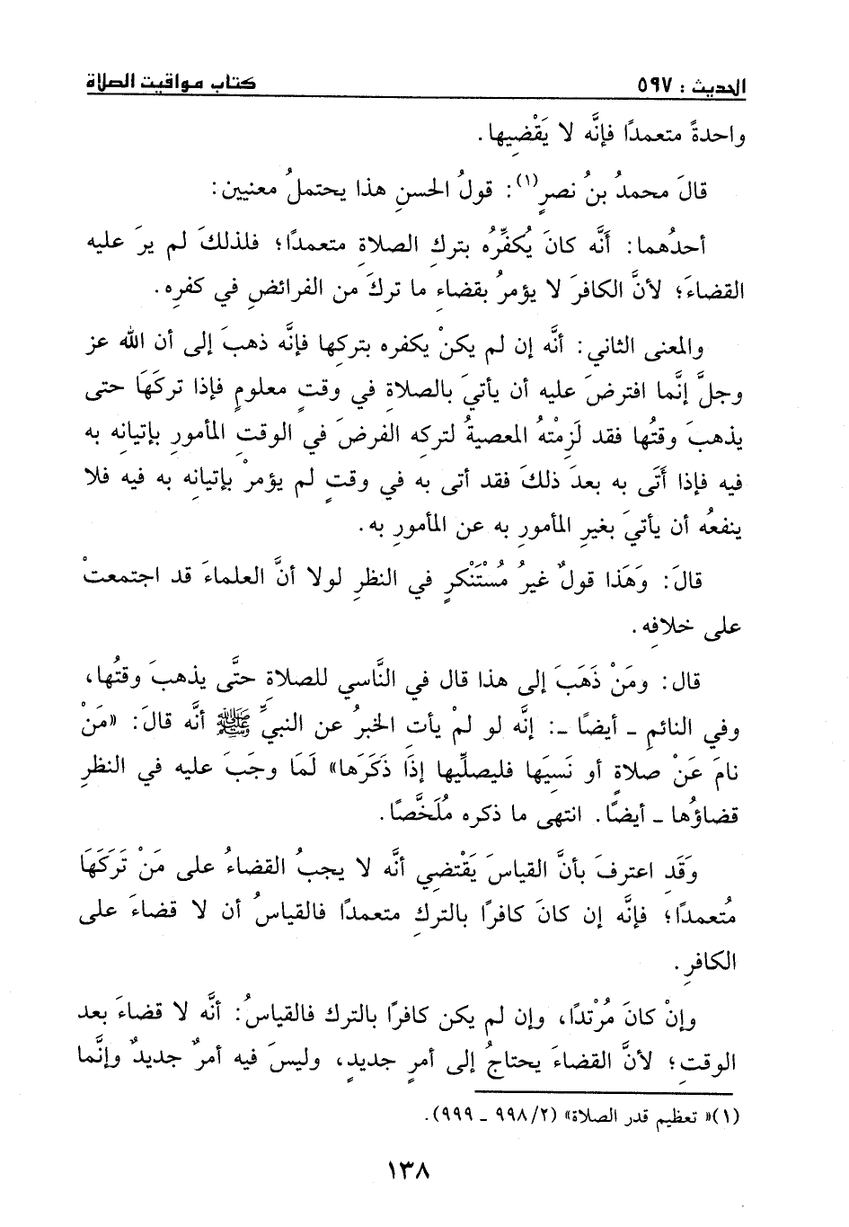والمعنى الثاني: أنه إن لم يكن يكفره بتركها، فإنه ذهب إلى أن الله عز وجل إنما افترض عليه أن يأتي بالصلاة في وقت معلوم، فإذا تركها حتى يذهب وقتها فقد لزمته المعصية؛ لتركه الفرض في الوقت المأمور بإتيانه به فيه، فإذا أتى به بعد ذلك، فقد أتى به في وقت لم يؤمر بإتيانه به فيه، فلا ينفعه أن يأتي بغير المأمور به، عن المأمور به.