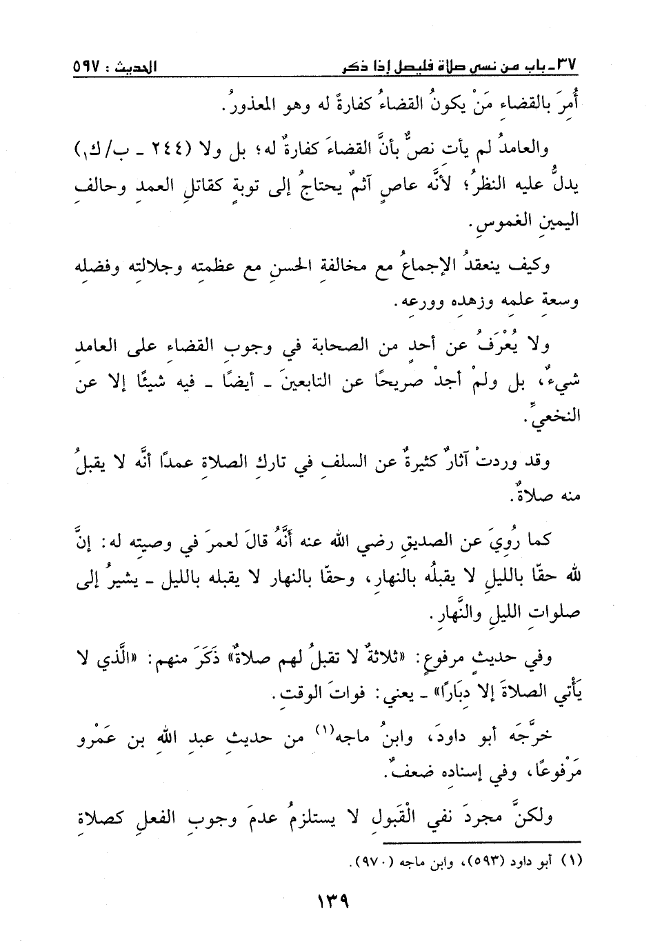 وقد وردت آثار كثيرة عن السلف في تارك الصلاة عمداً، أنه لا تقبل منه صلاة، كما روي عن الصديق - رضي الله عنه -، أنه قال لعمر في وصيته له: إن لله حقاً بالليل لا يقبله بالنهار، وحقاً بالنهار لا يقبله بالليل.